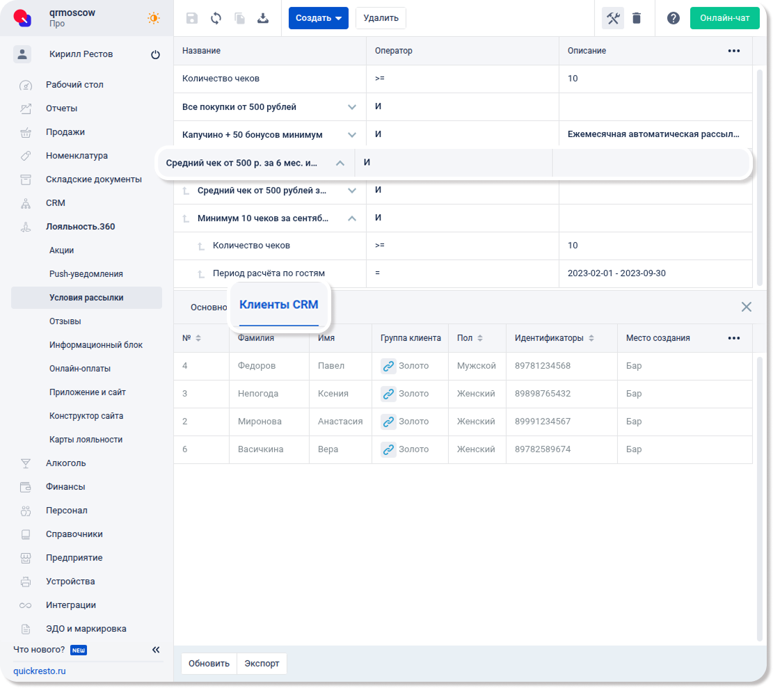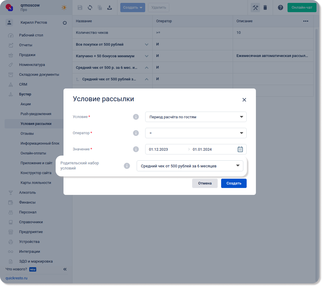 Набор для рассылки гостям со средним чеком за полгода от 500 ₽ и количеством чеков за сентябрь от 10 будет готов. С помощью стрелок в названиях наборов можно просмотреть, какие условия и наборы условий вложены в них.