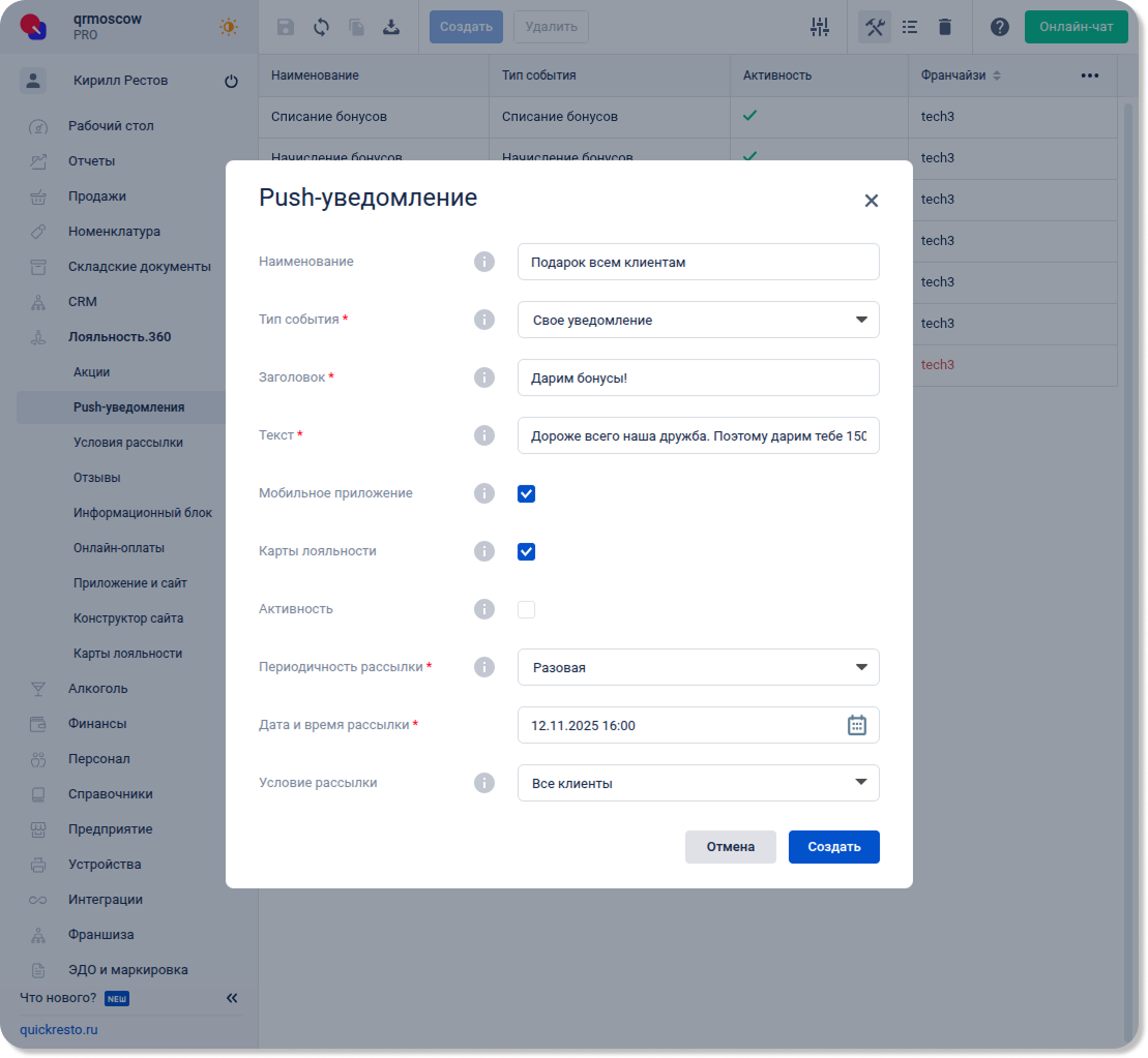 Чтобы отправить уведомление с созданными условиями рассылки, переходим в раздел Лояльность.360 — Push-уведомления, создаем новое уведомление и указываем в его параметрах набор, который мы создали. Подробнее о создании и отправке уведомлений.