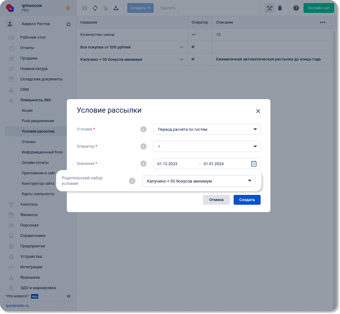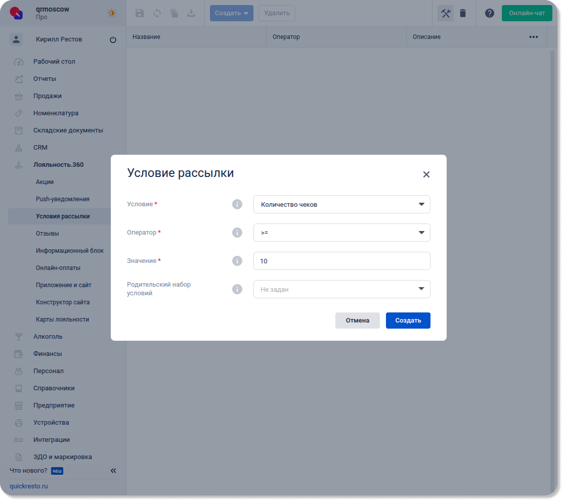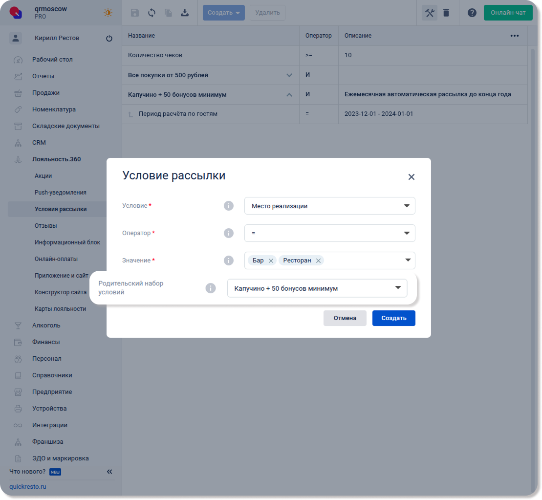 Перейдите в раздел Лояльность.360 — Условия рассылки, нажмите Создать и выберите Условие рассылки.