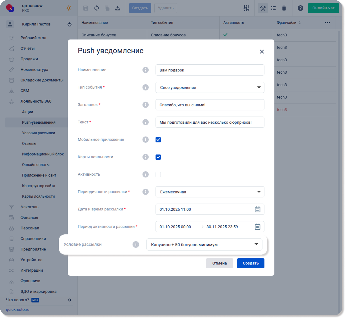 Затем, чтобы отправить уведомление с этими условиями рассылки, переходим в раздел Лояльность.360 — Push-уведомления, создаем новое уведомление и указываем в его параметрах набор, который мы создали. Подробнее о создании и отправке уведомлений.