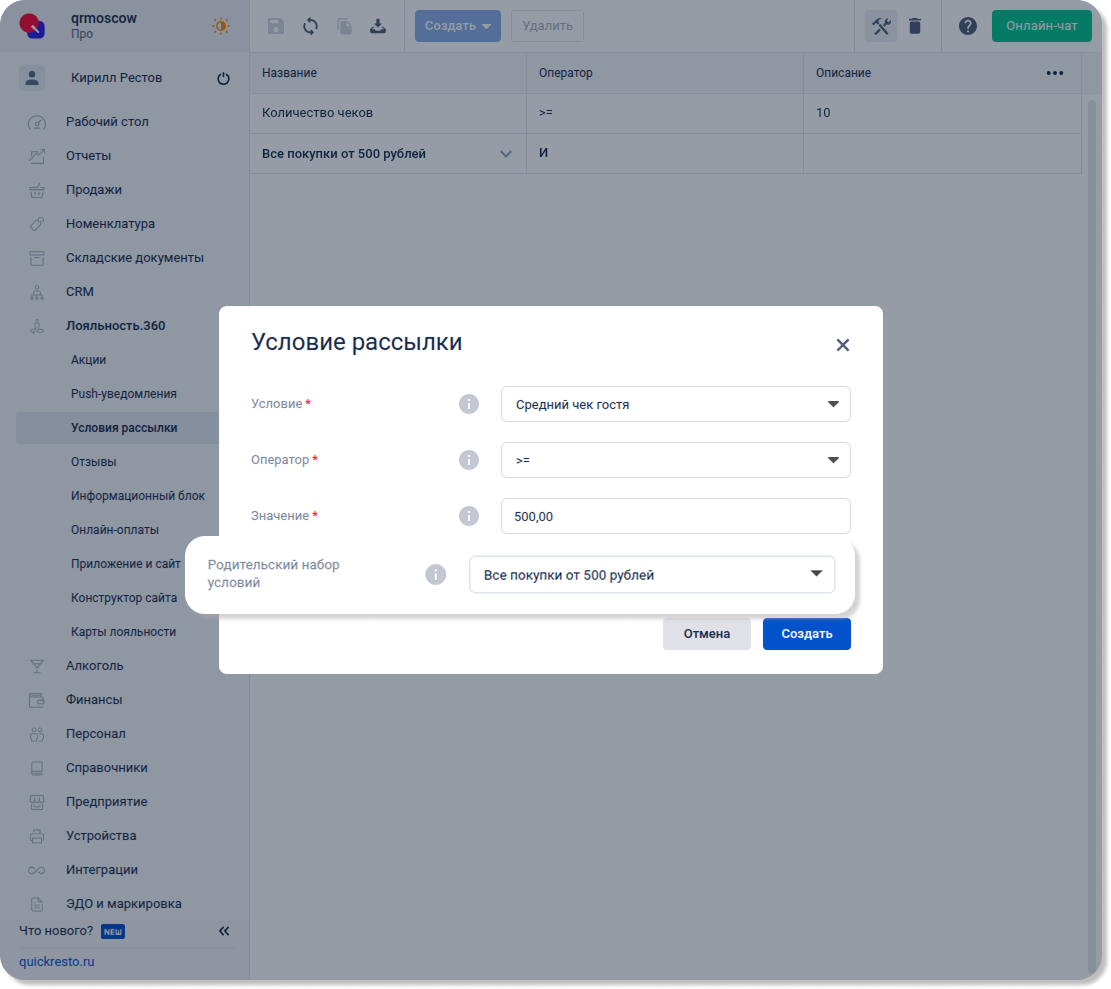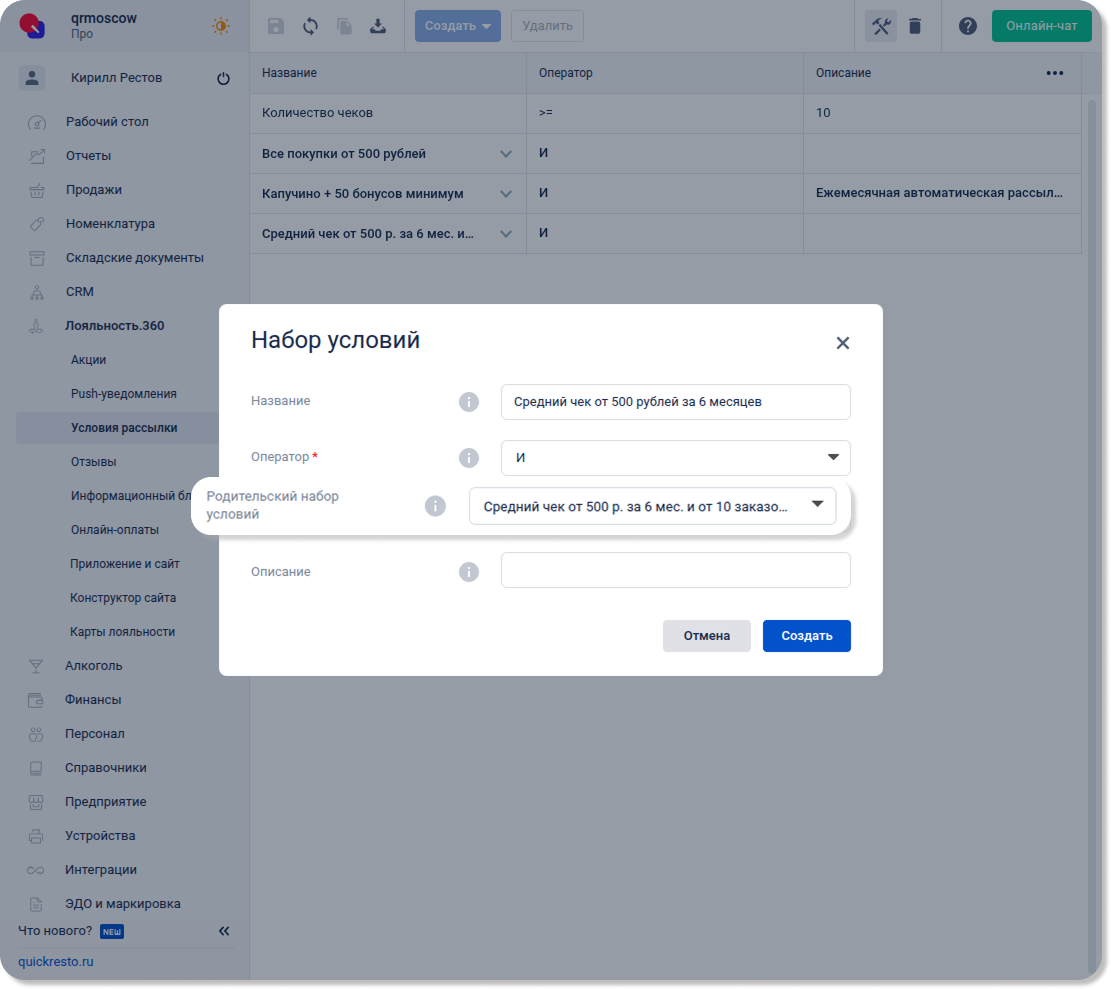 Перейдите в раздел Лояльность.360 — Условия рассылки, нажмите Создать и выберите Набор условий.