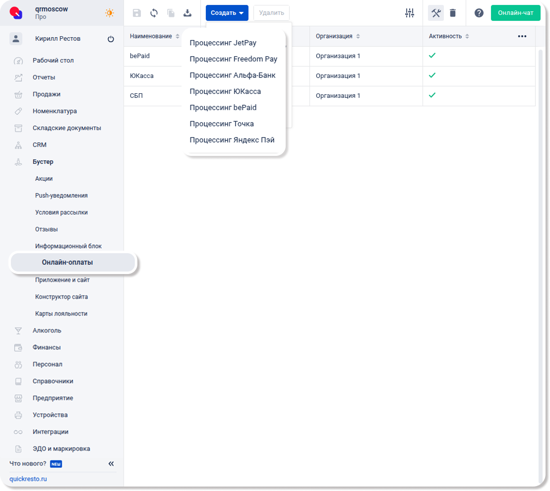 Перейдите в раздел Бустер — Онлайн-оплаты — Нажмите Создать на верхней панели инструментов и в выпадающем меню выберите нужный процессинг.