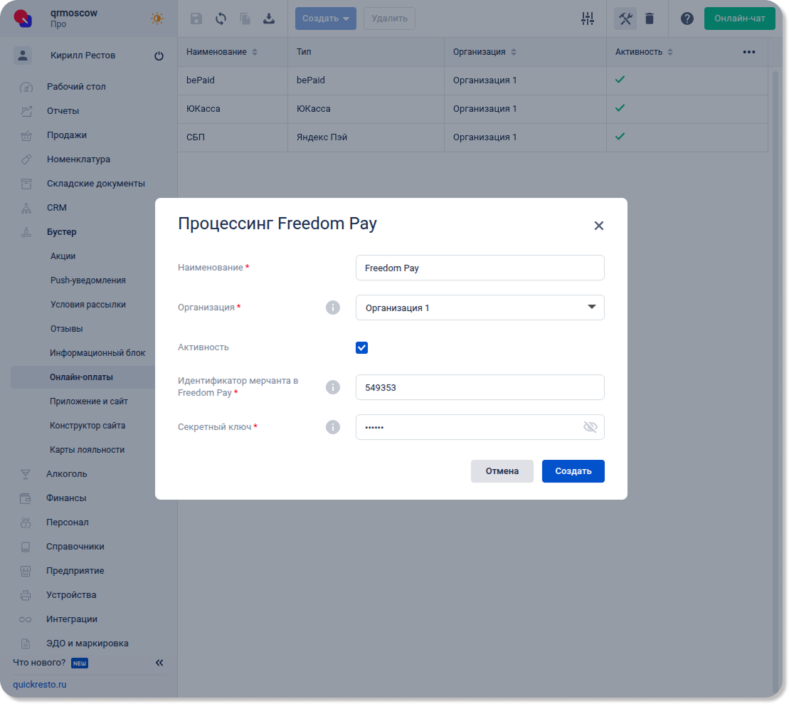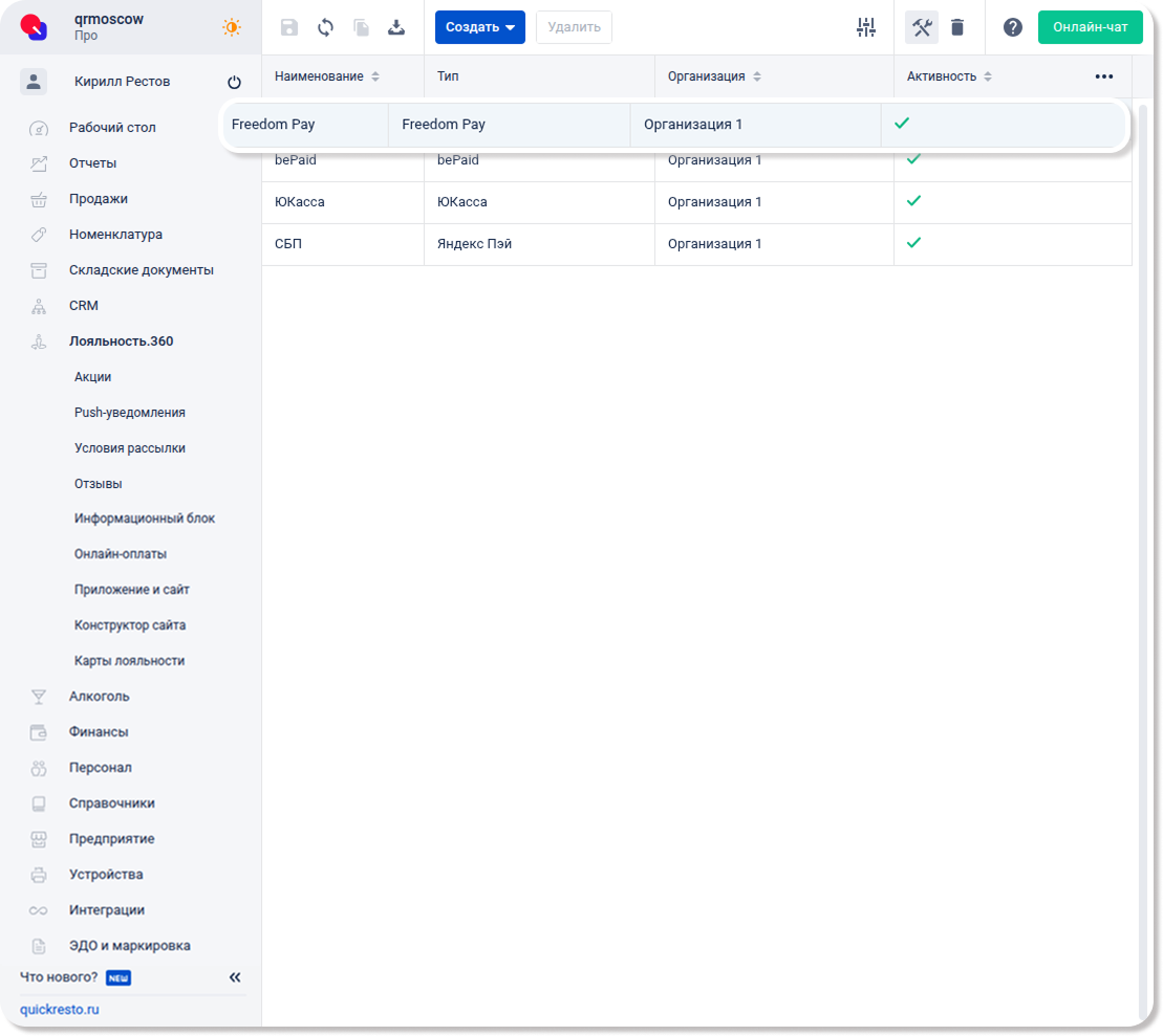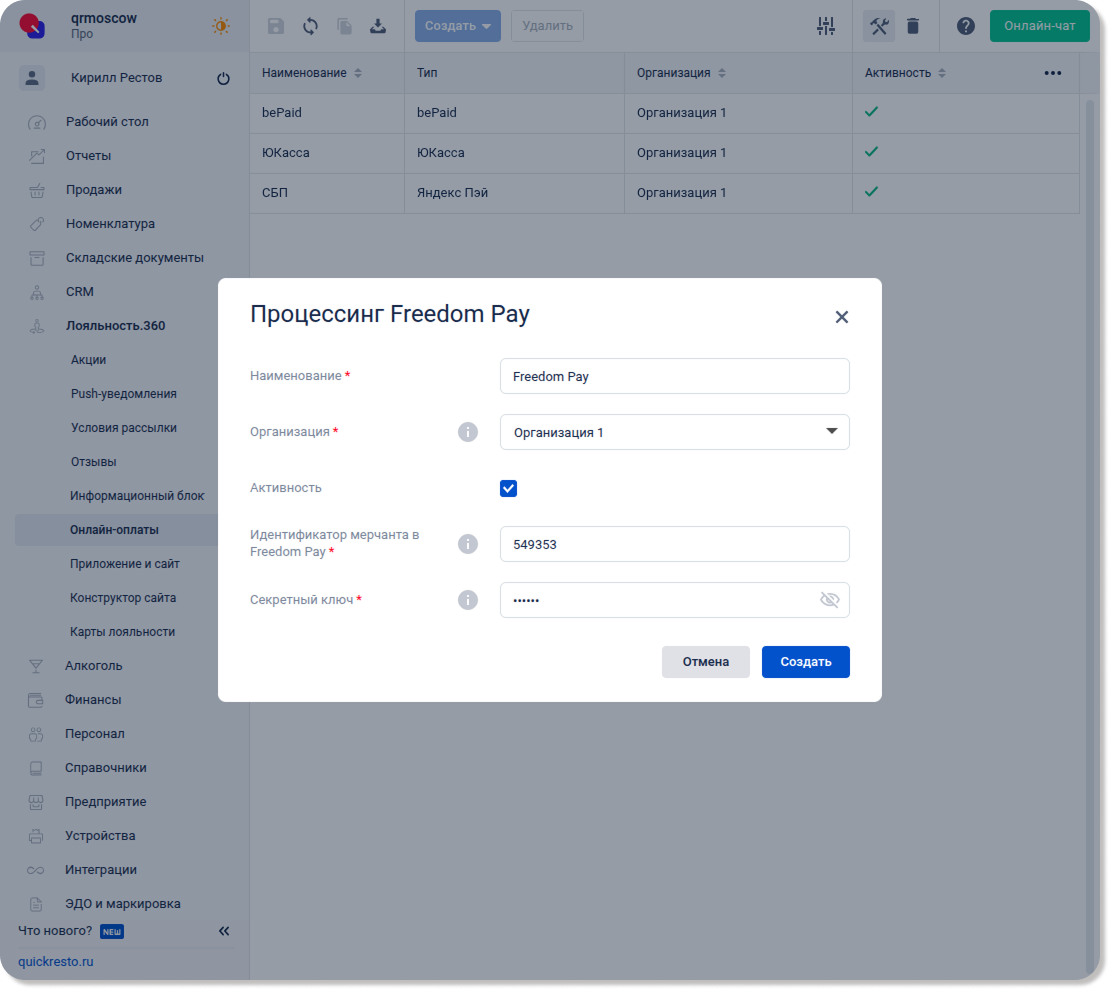 Перейдите в раздел Лояльность.360 — Онлайн-оплаты — Нажмите Создать на верхней панели инструментов и в выпадающем меню выберите нужный процессинг.
