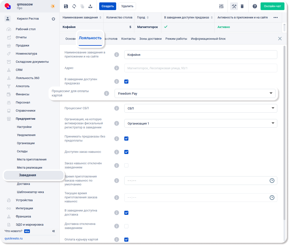 Далее необходимо привязать к каждому заведению нужный процессинг. Перейдите в раздел Предприятие — Заведения и выберите нужное заведение. На вкладке Лояльность активируйте флаг В заведении доступен предзаказ, чтобы появилось поле выбора процессинга, который будет использоваться для этого заведения. Выберите необходимый процессинг и сохраните настройки.