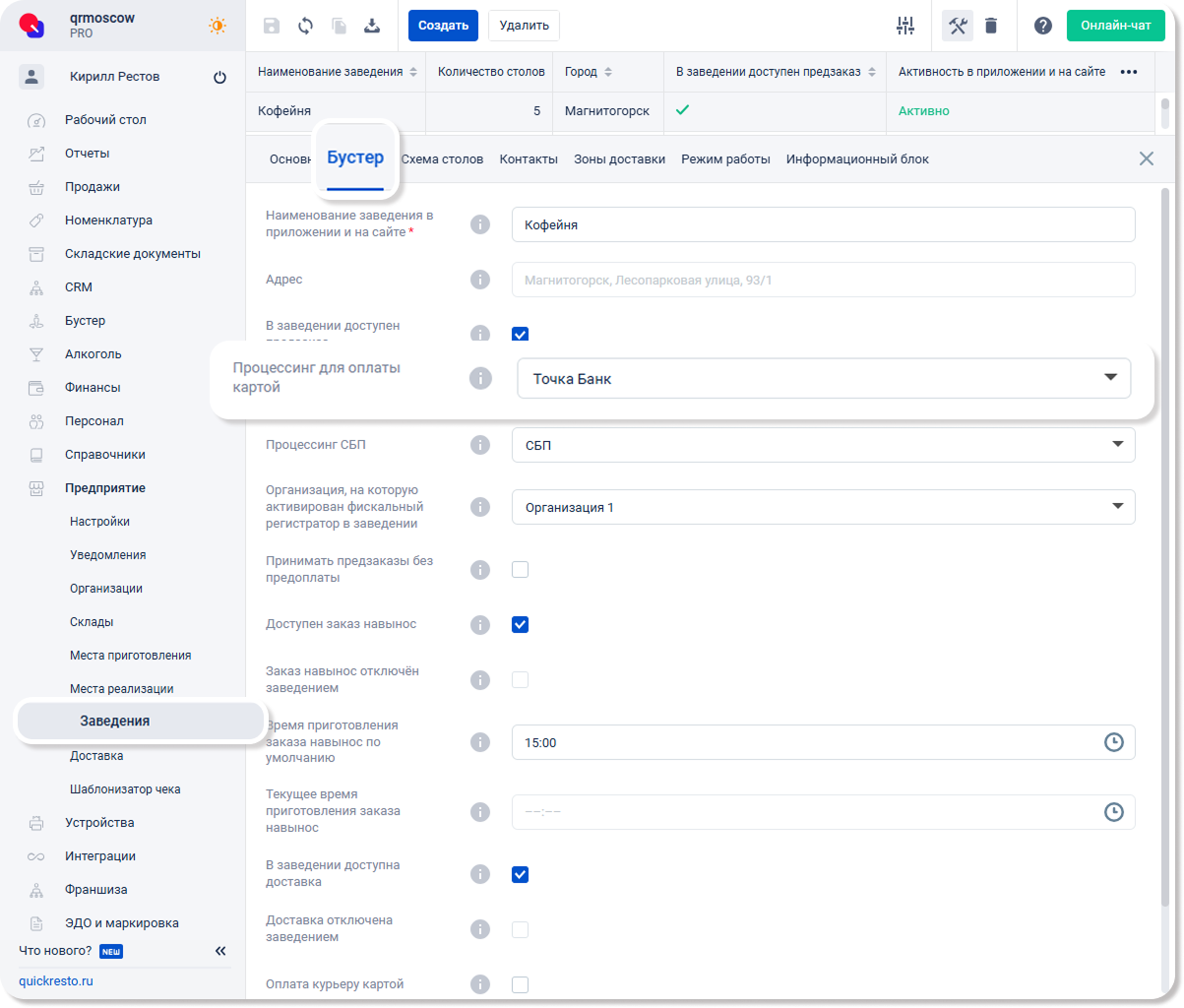 После этого перейдите в раздел Предприятие — Заведения — Выберите заведение — Перейдите на вкладку Бустер — Активируйте флаг В заведении доступен предзаказ, чтобы появилось поле выбора процессинга — В поле Процессинг для оплаты картой установите созданный Процессинг Точка.