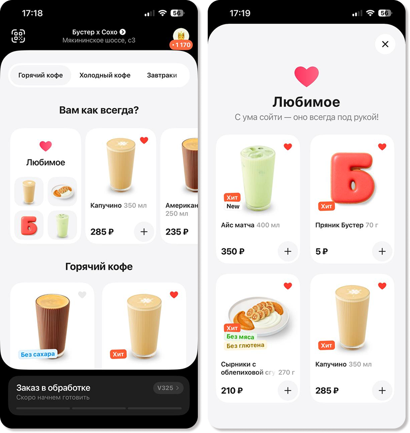 Вам как всегда? Этот раздел расположен на главном экране приложения, сразу после блока с акциями, скидками и бонусными программами. Он обеспечивает быстрый доступ к вашим предпочтениям и состоит из двух частей: