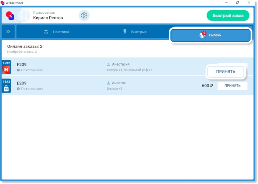 2. Заказ поступает на кассовый терминал Quick Resto и доступен для просмотра на вкладке Онлайн заказы.
