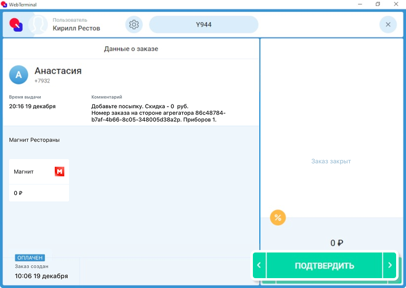 Работа с заказами Магнит Рестораны на Windows-терминале