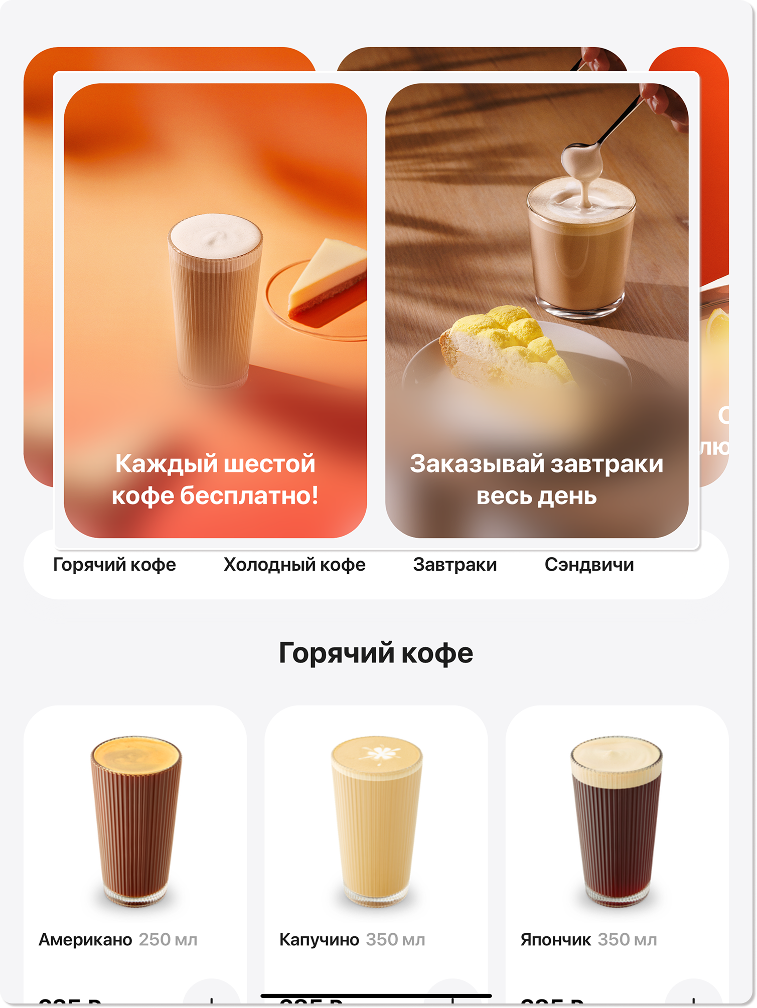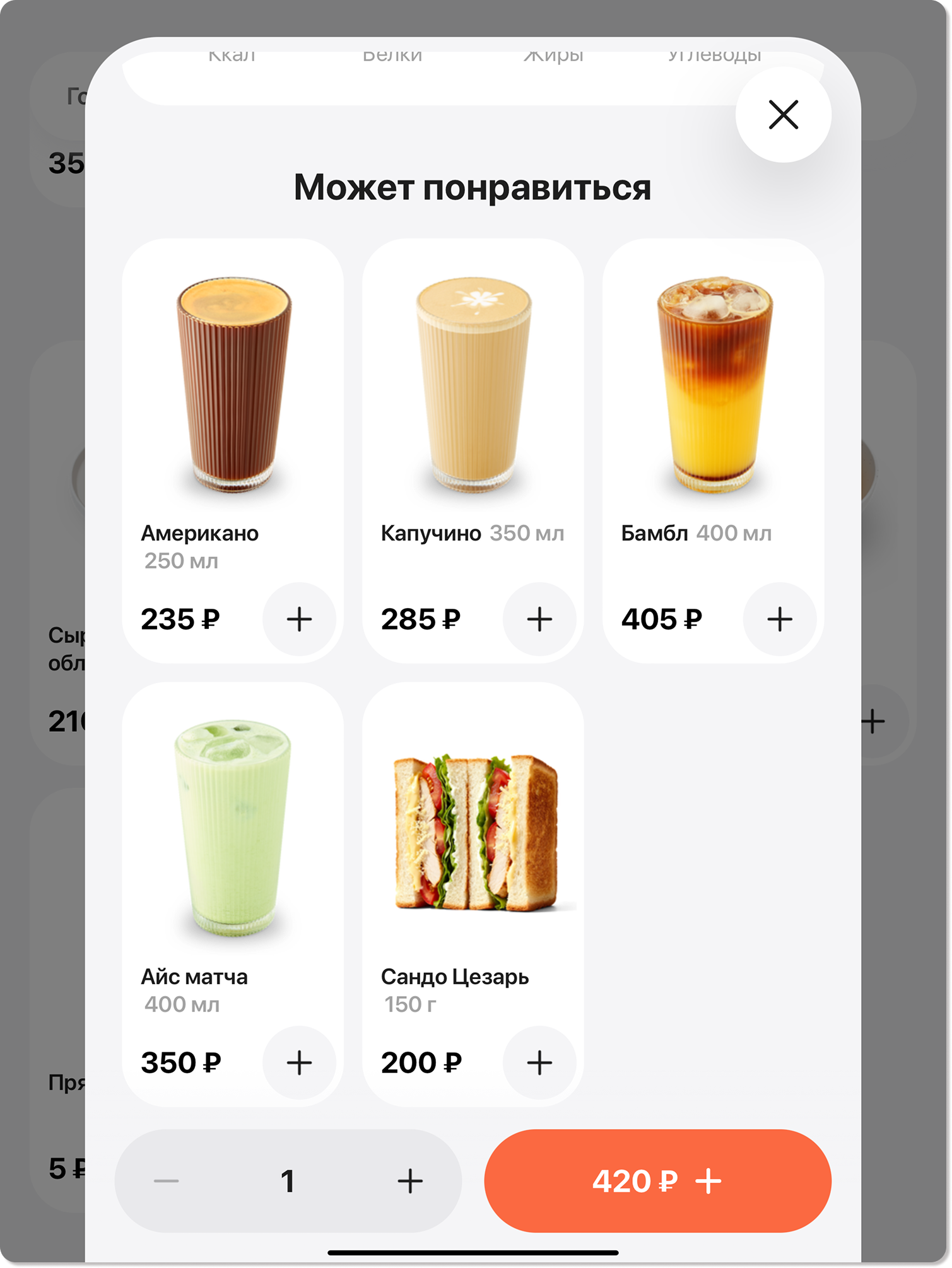 2. Просмотрите доступные блюда. На карточке каждого блюда отображается не только его стоимость, но и вес/объем, что поможет вам сделать осознанный выбор.