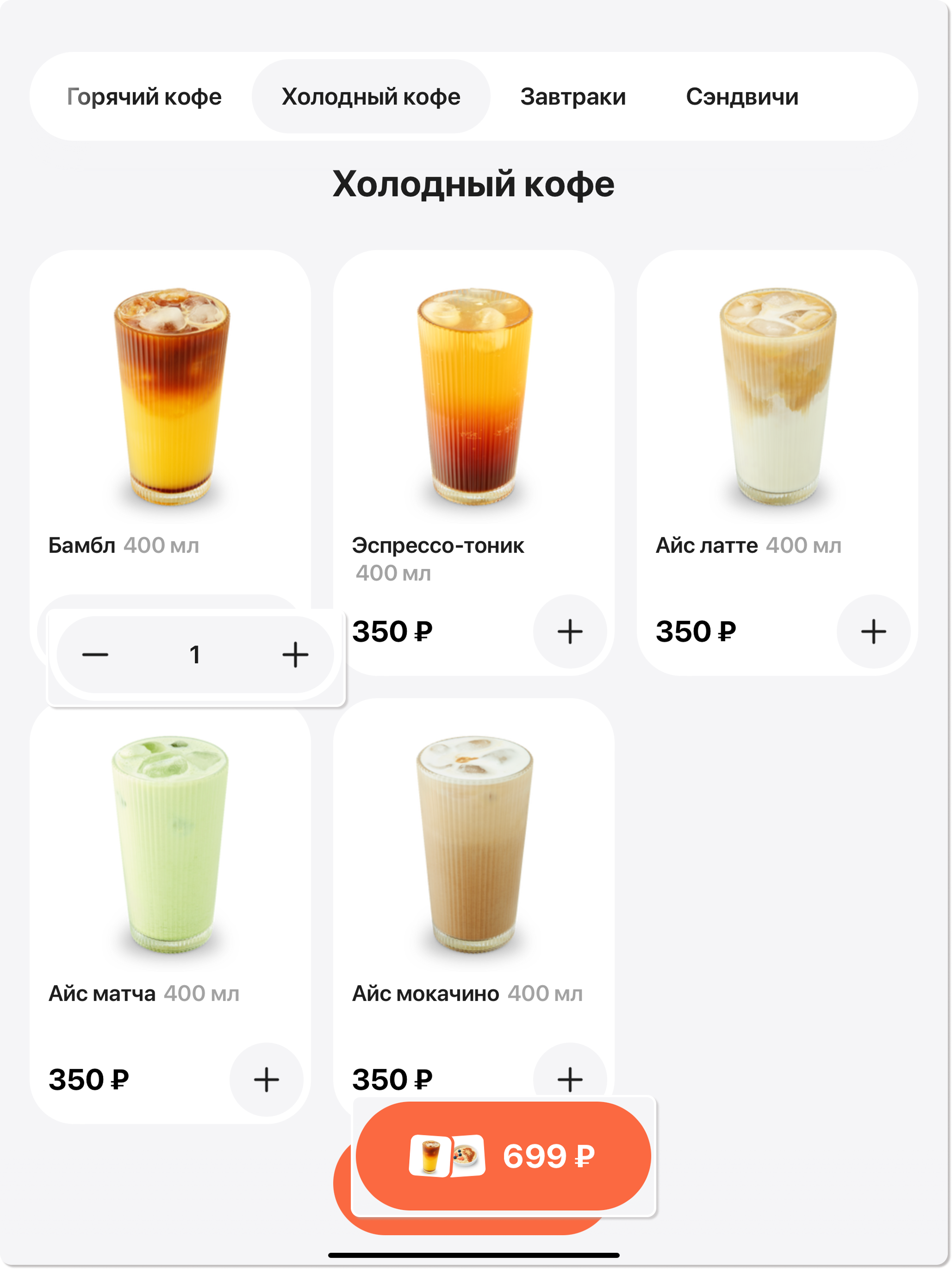 2. Просмотрите доступные блюда. На карточке каждого блюда отображается не только его стоимость, но и вес/объем, что поможет вам сделать осознанный выбор.