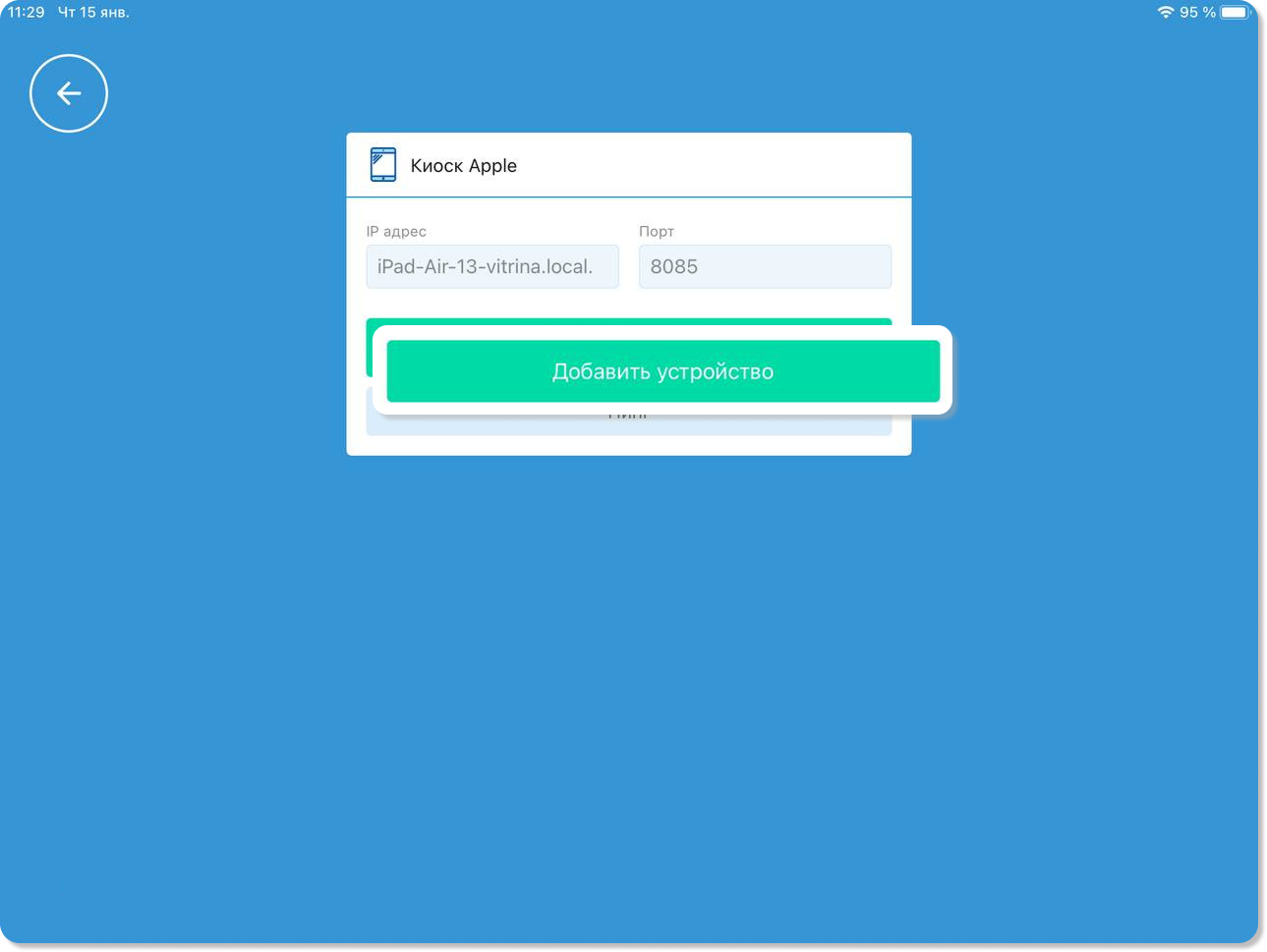 4. Убедитесь, что оба планшета (с кассовым приложением и с Бустер Киоск) подключены к одной сети. Киоск самообслуживания отобразится в результатах автоматического поиска (Киоск). Выберите на него.