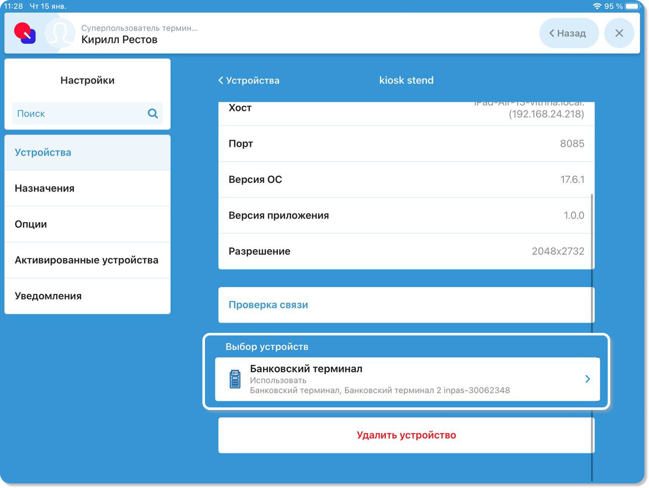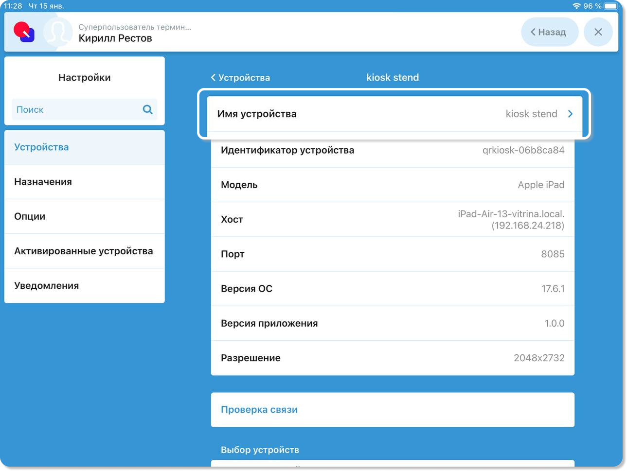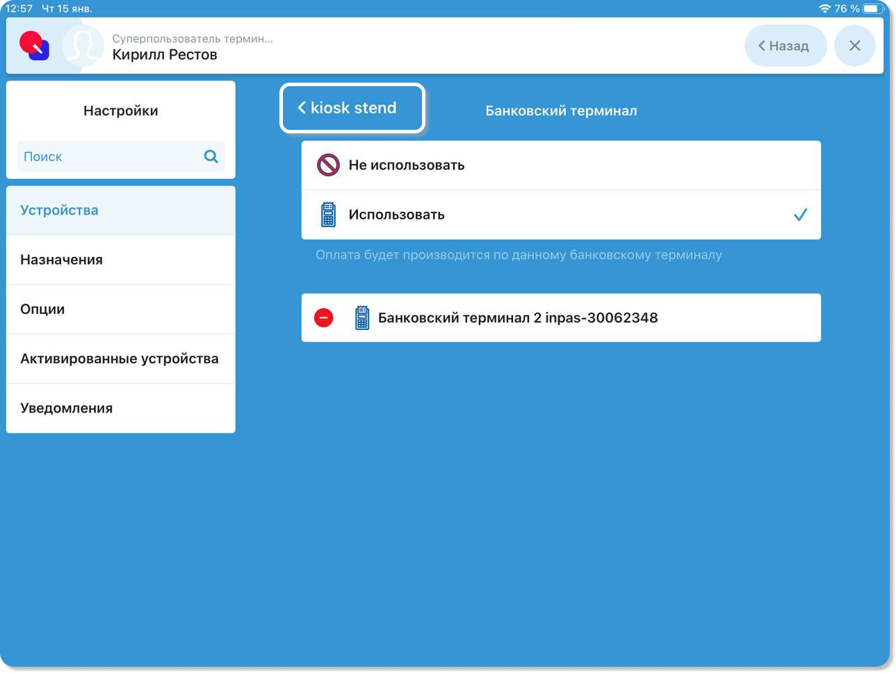 Примечание! При необходимости в поле Имя устройства можно ввести имя киоск, чтобы он отображался в списке заказов именно под этим именем.