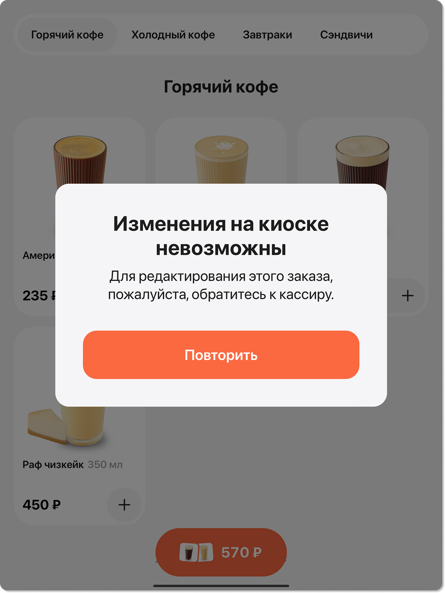 Если кассир случайно выполнит какое-либо действие с этим заказом на кассовом терминале (например, отправит его на кухню, распечатает пречек или начнет частичную оплату) до того, как гость закончит работу с киоском (добавит/удалит позиции или оплатит заказ), гость не сможет завершить свои действия в киоске.