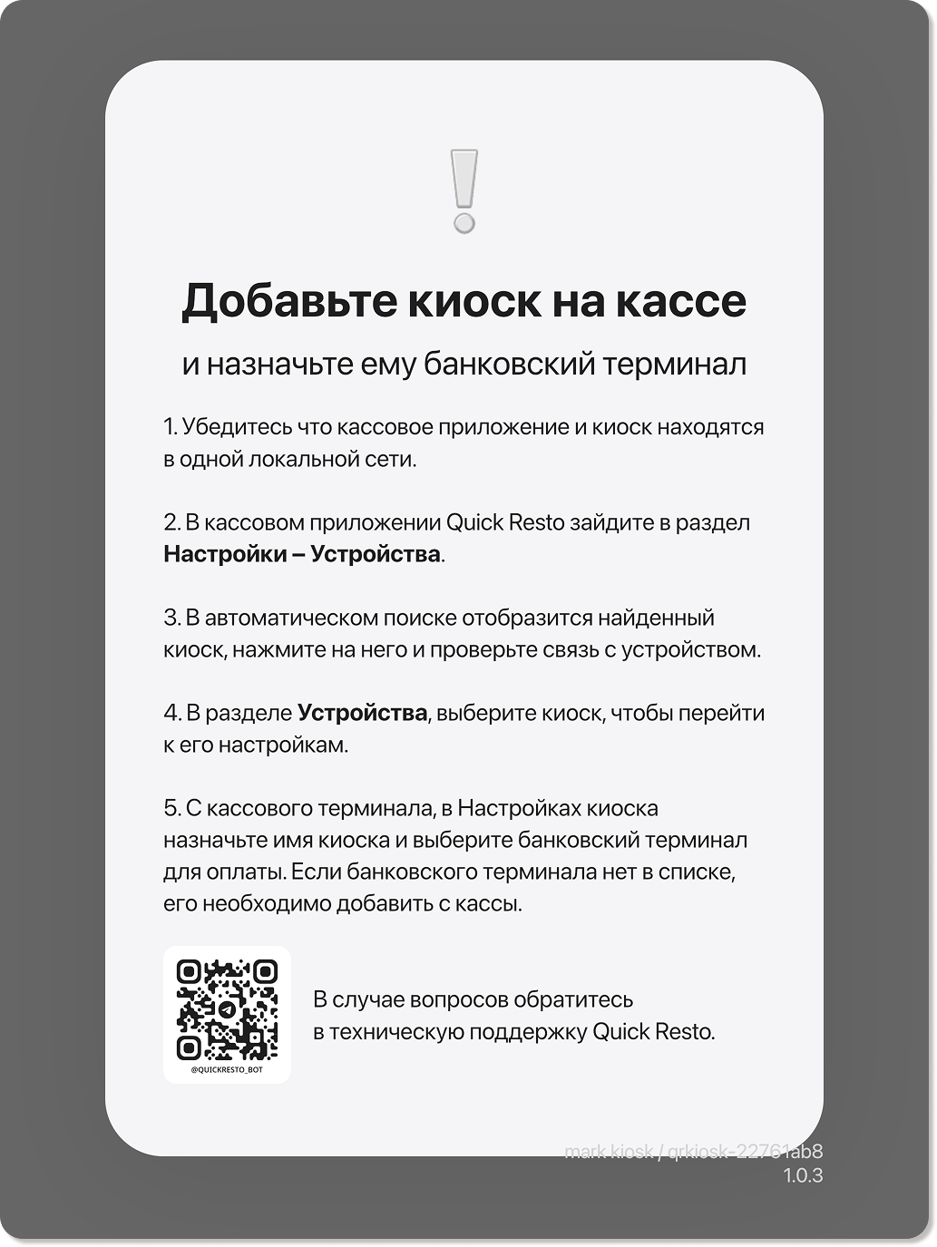 При первом запуске приложения вы увидите инструкцию, которая объяснит, как активировать киоск самообслуживания на кассовом терминале.