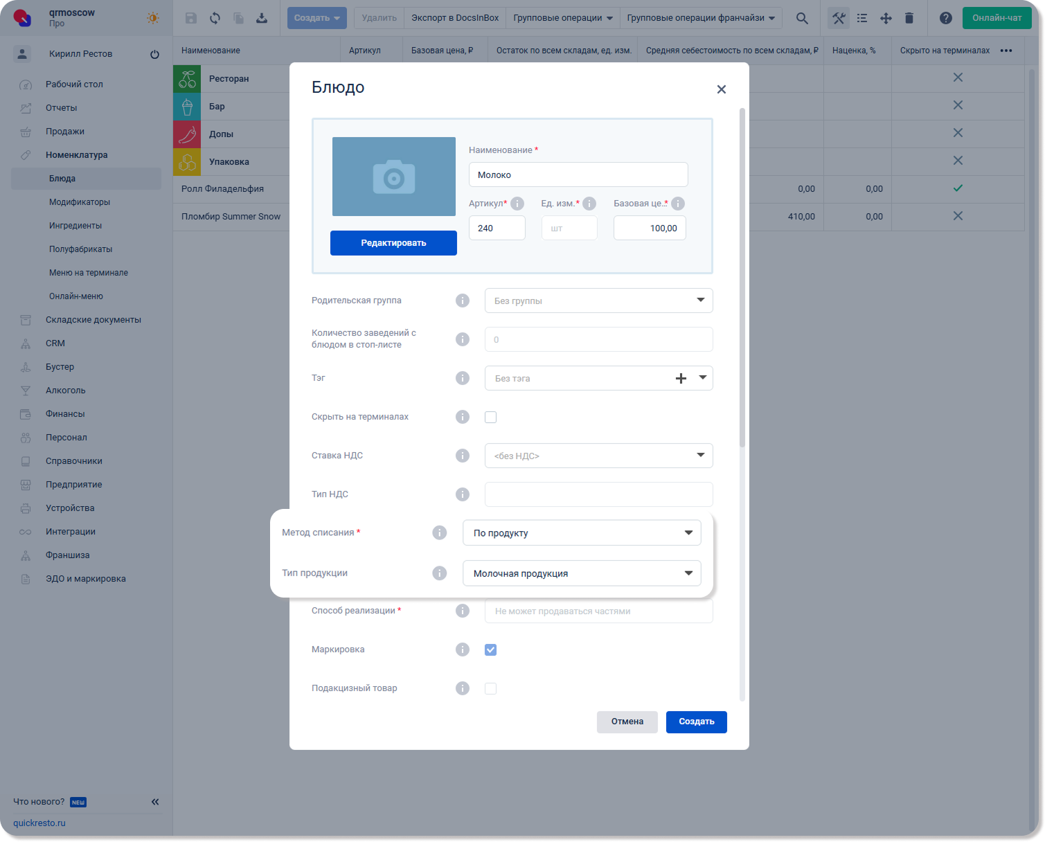 При продаже молочных продуктов нужно завести блюдо с методом списания По продукту и с типом продукции Молочная продукция. Данный выбор значения будет влиять на автоматическое изменение таких полей, как: