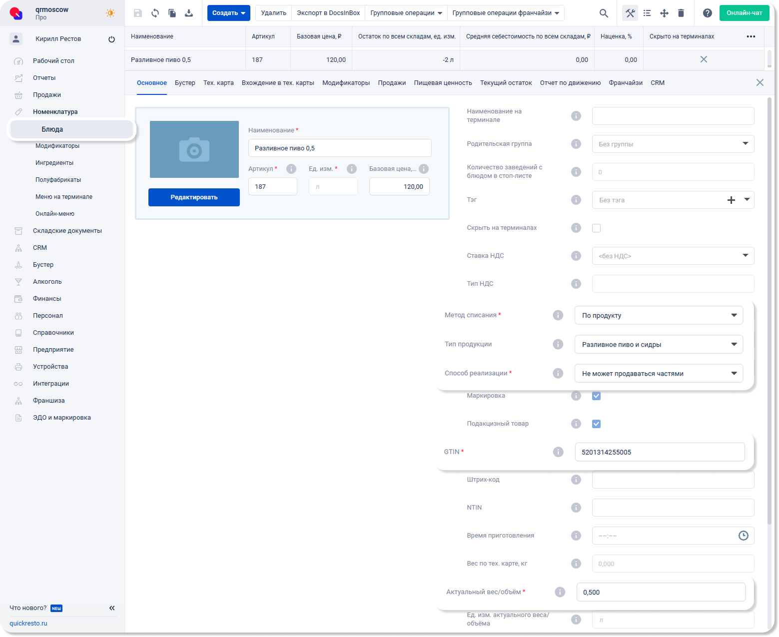Перед продажей пива (сидра) из кега необходимо настроить блюдо. Для этого перейдите в раздел Номенклатура — Блюда и для каждого из продуктов выполните действия: