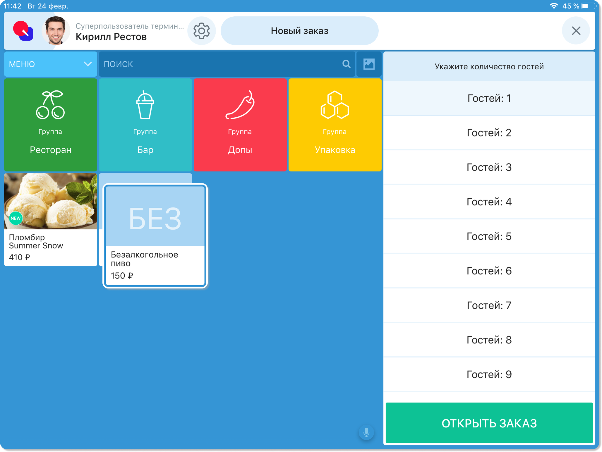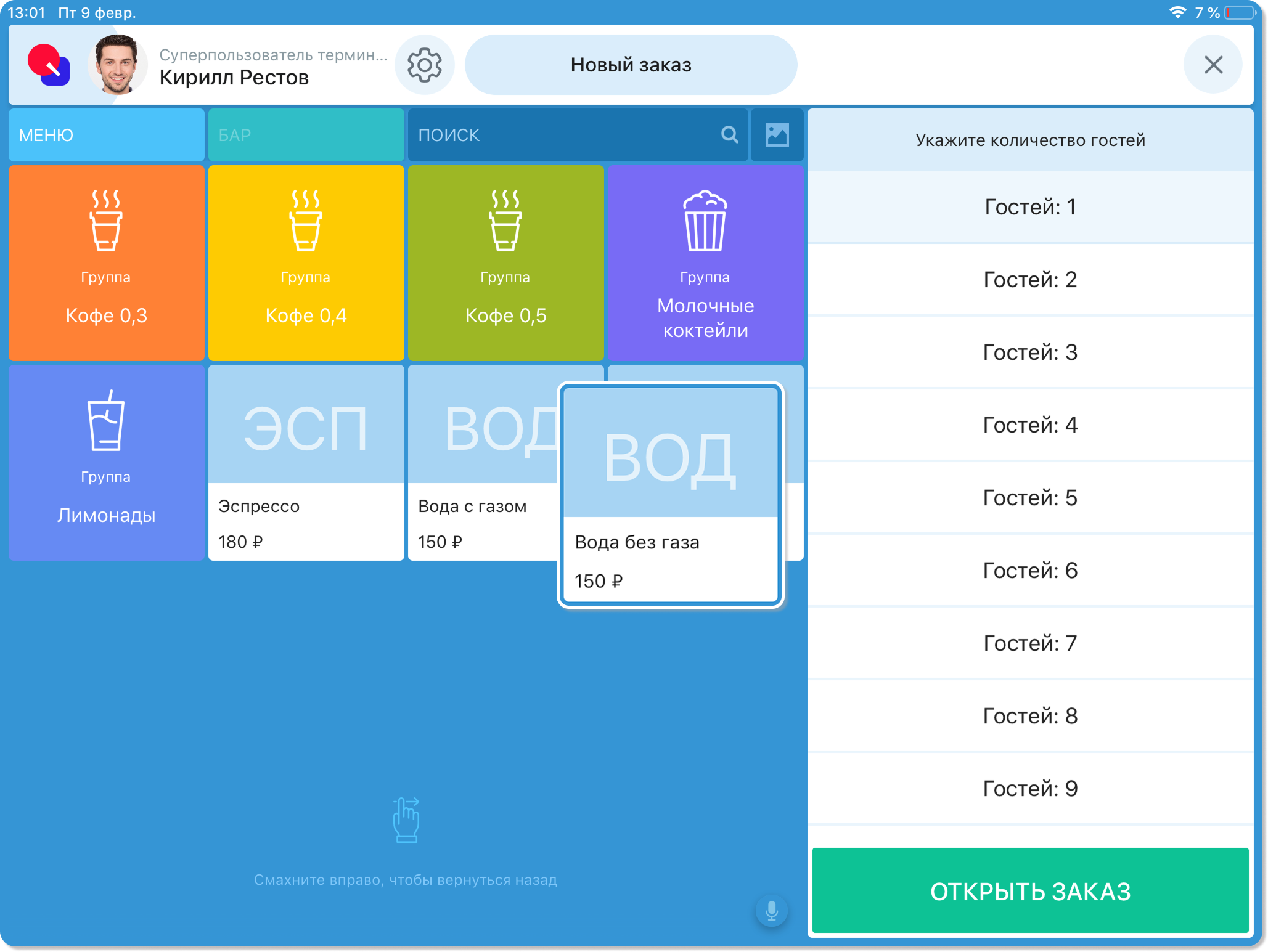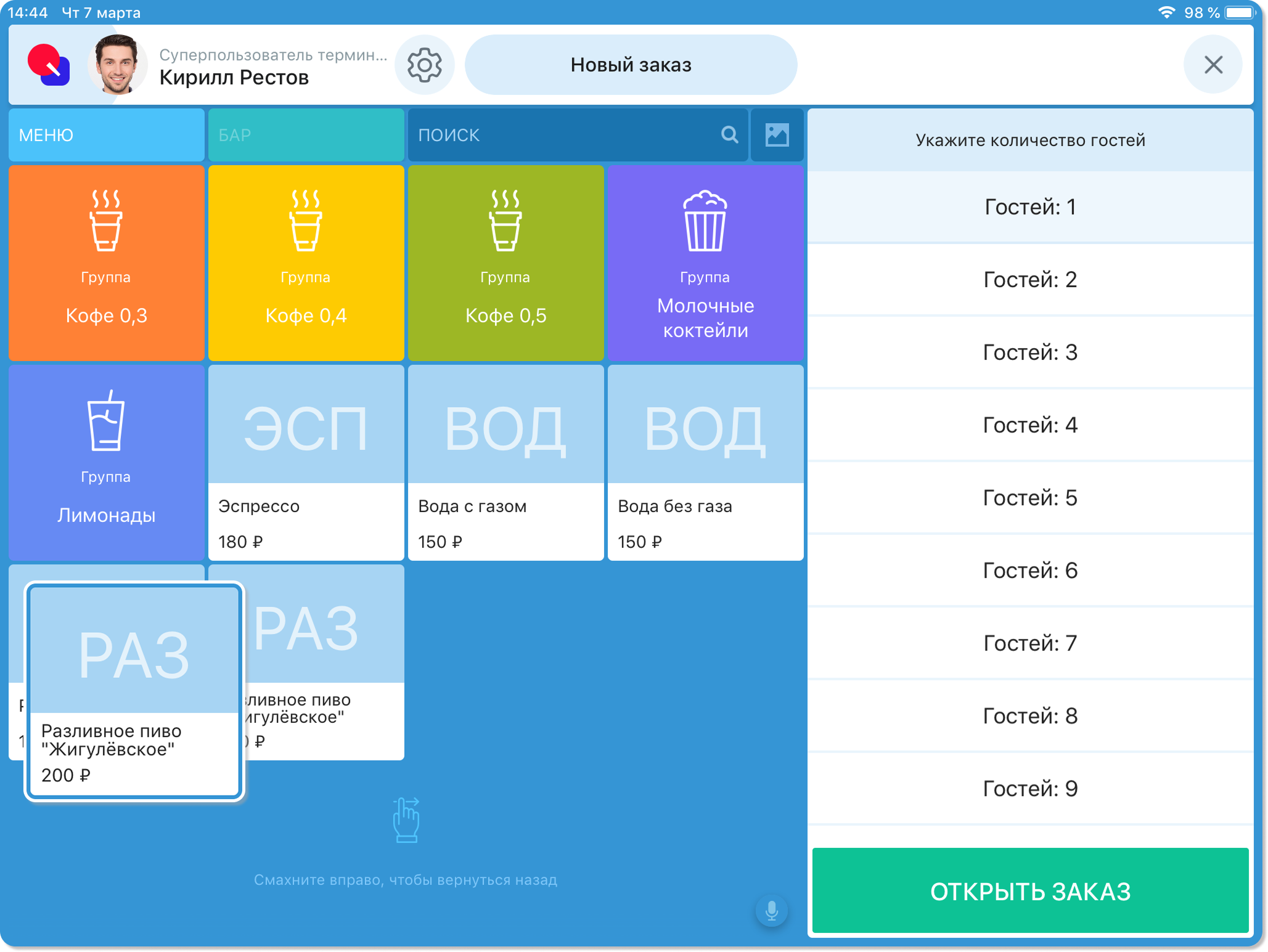 Для продажи сахаросодержащих напитков откройте на кассовом терминале заказ и выполните действия:
