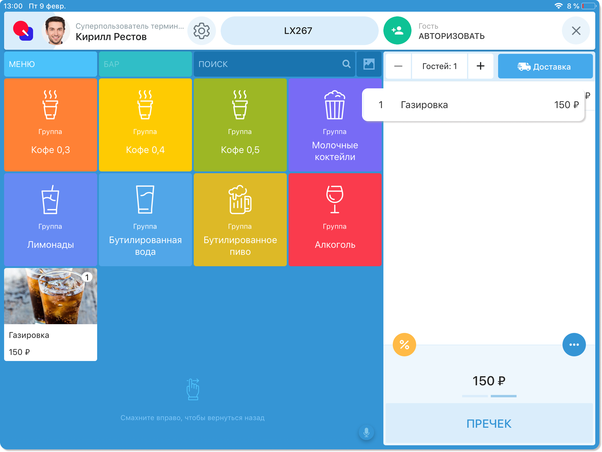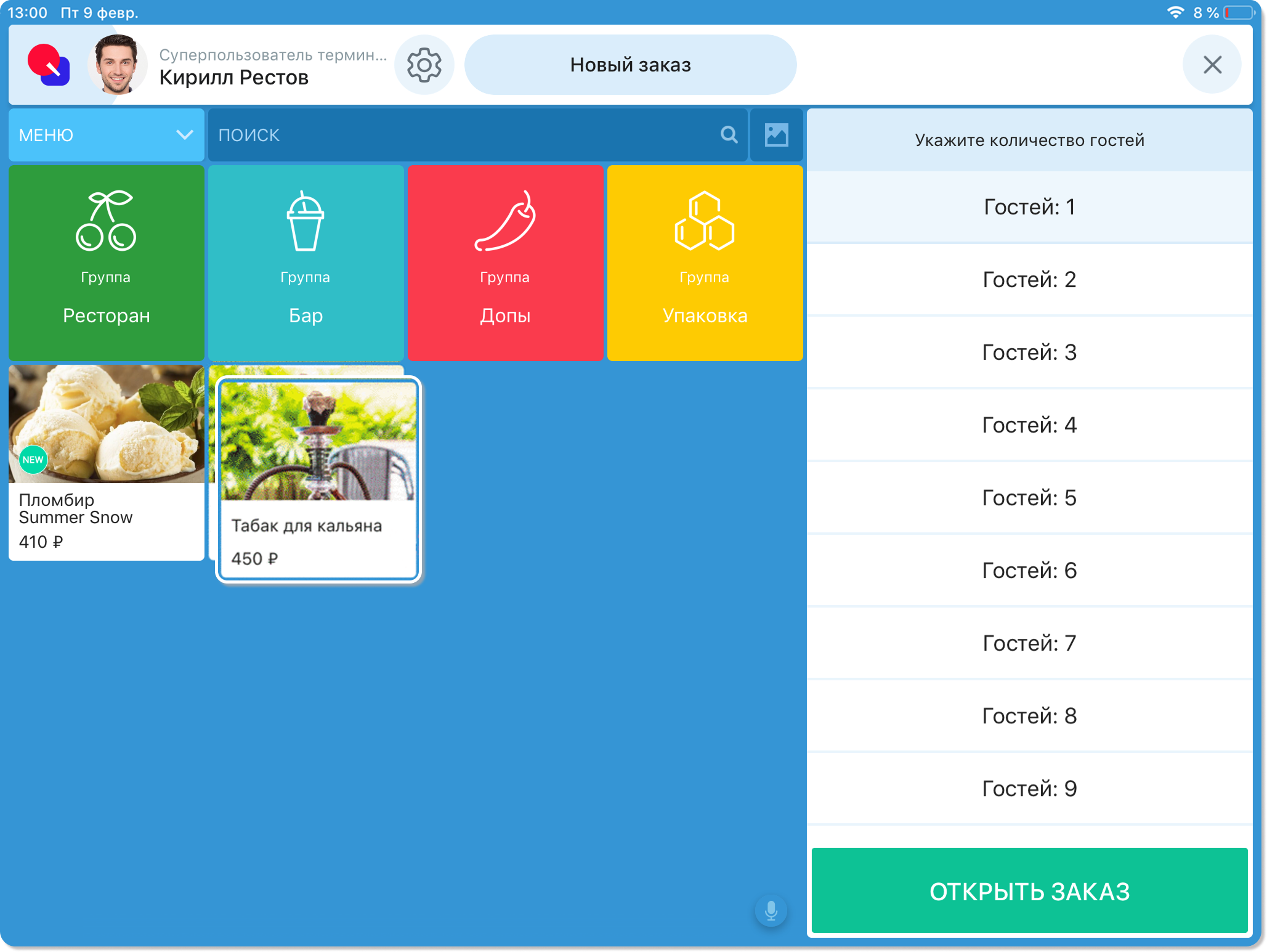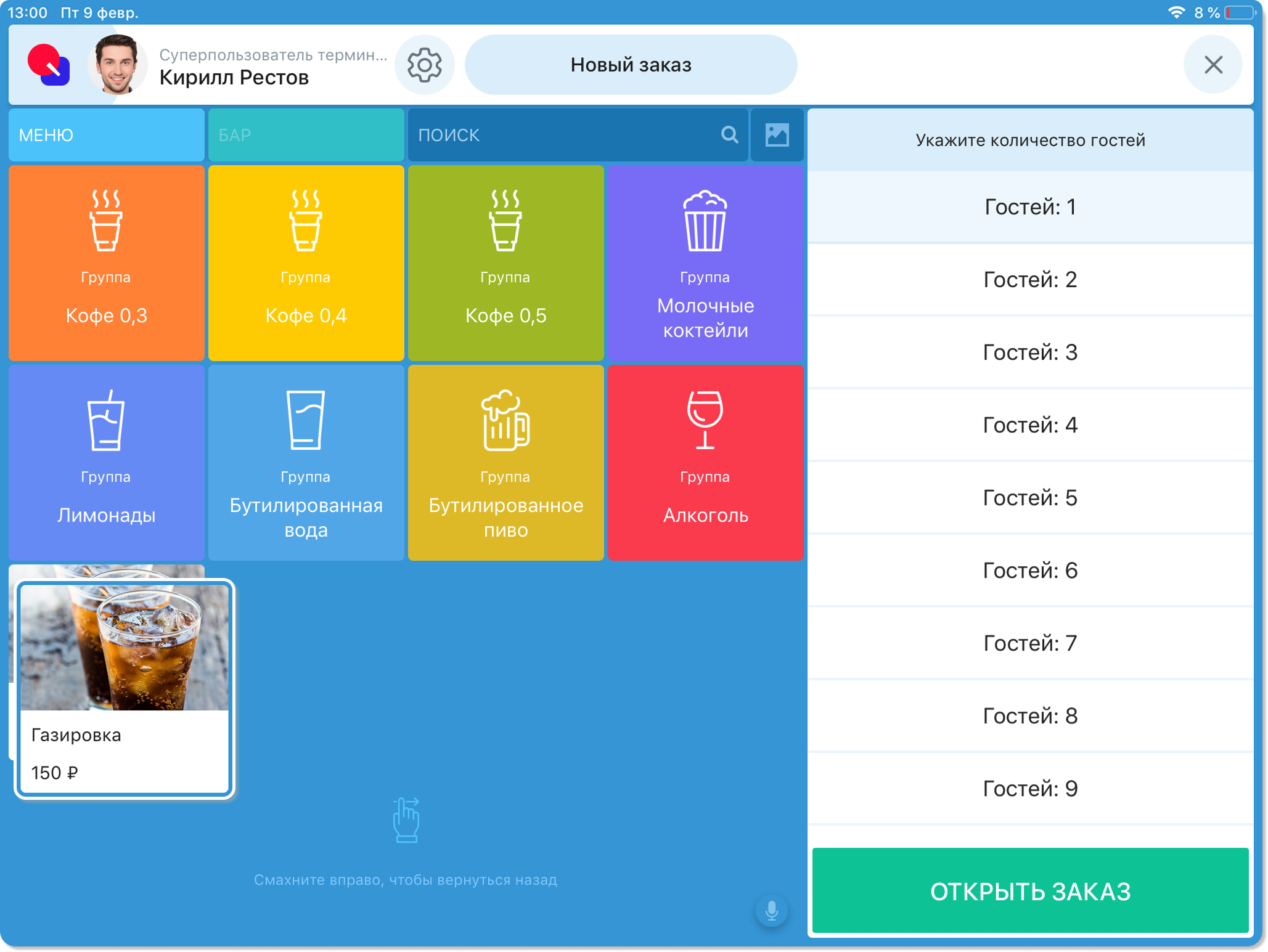 Для продажи сахаросодержащих напитков откройте на кассовом терминале заказ и выполните действия: