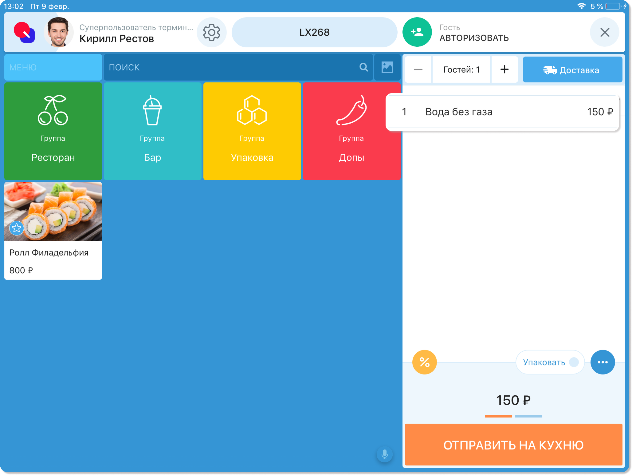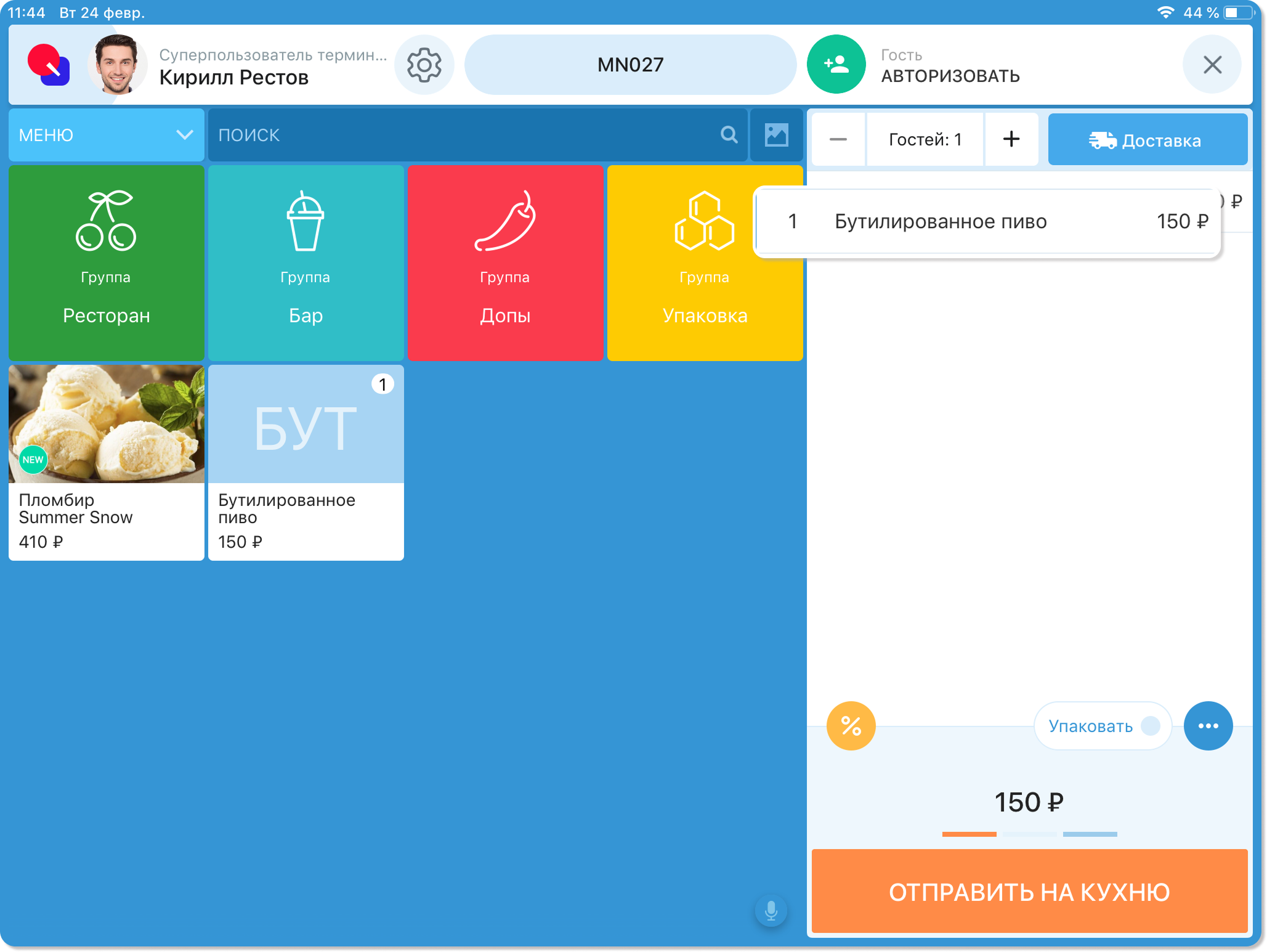 Для продажи разливного пива (сидра) на кассовом терминале со способом реализации «Требовать ввод веса при продаже», откройте заказ и выполните действия: