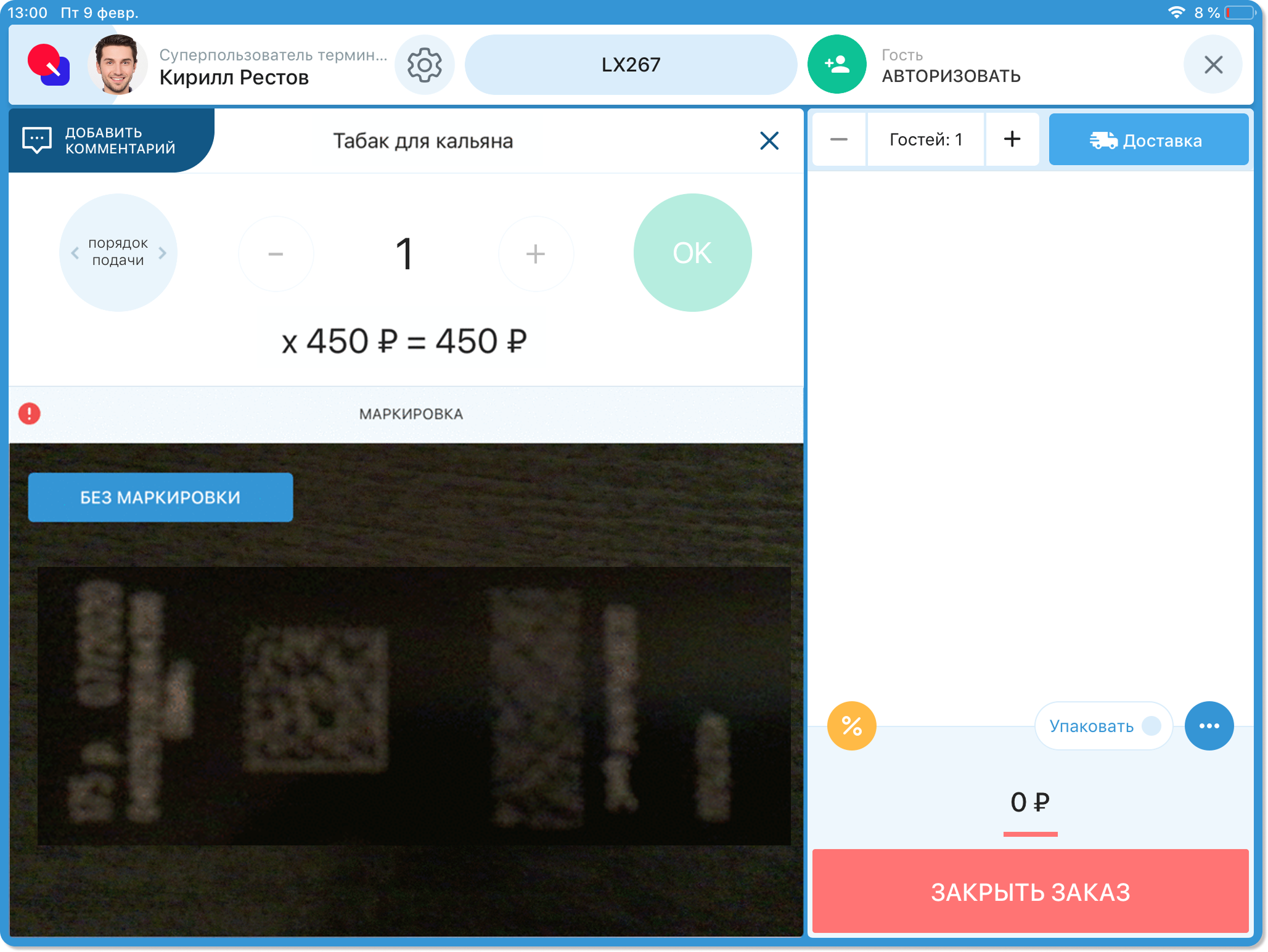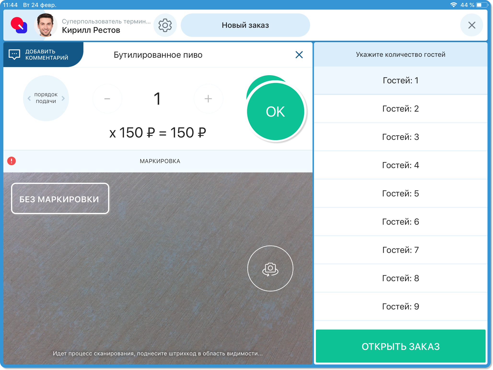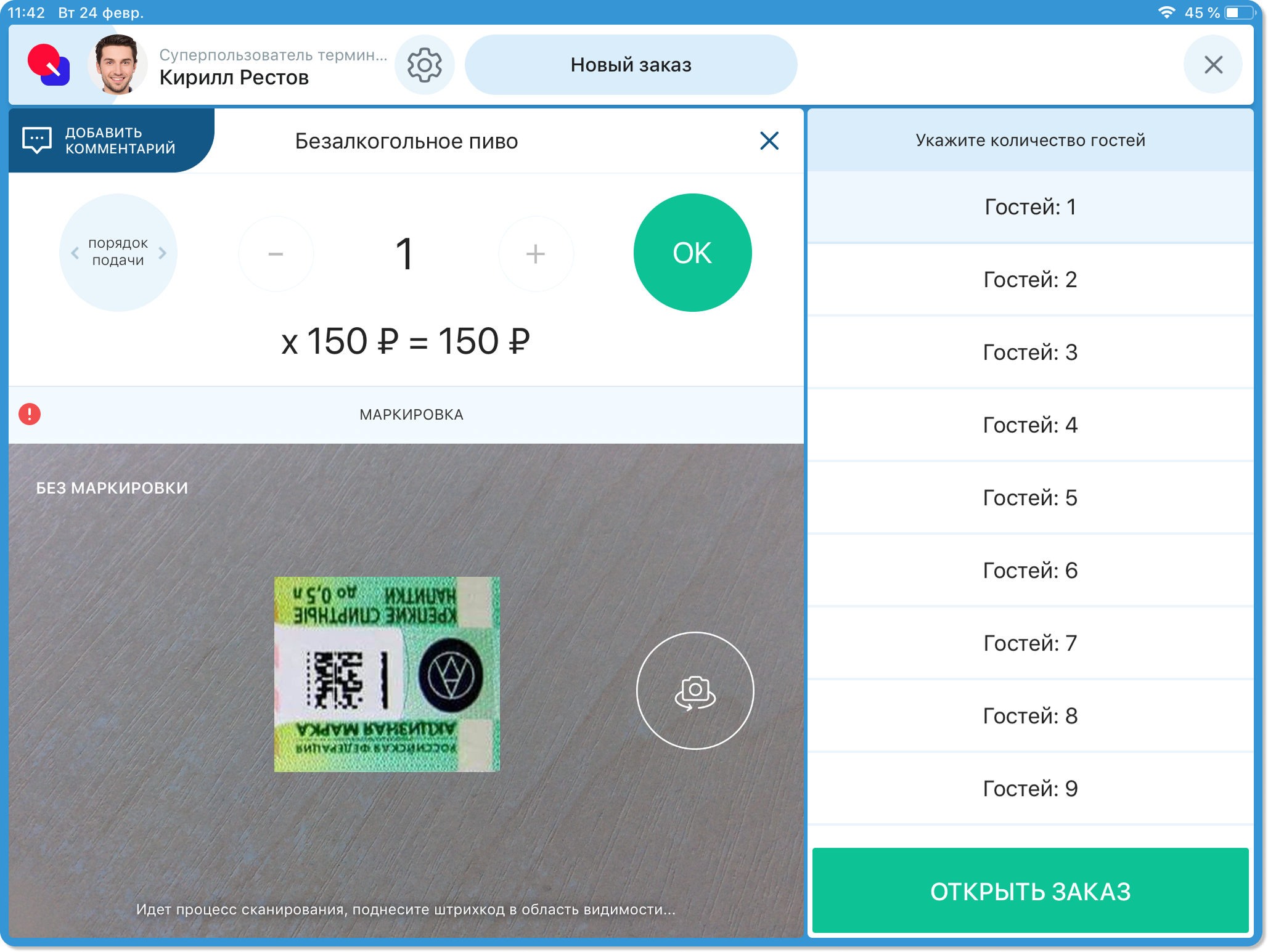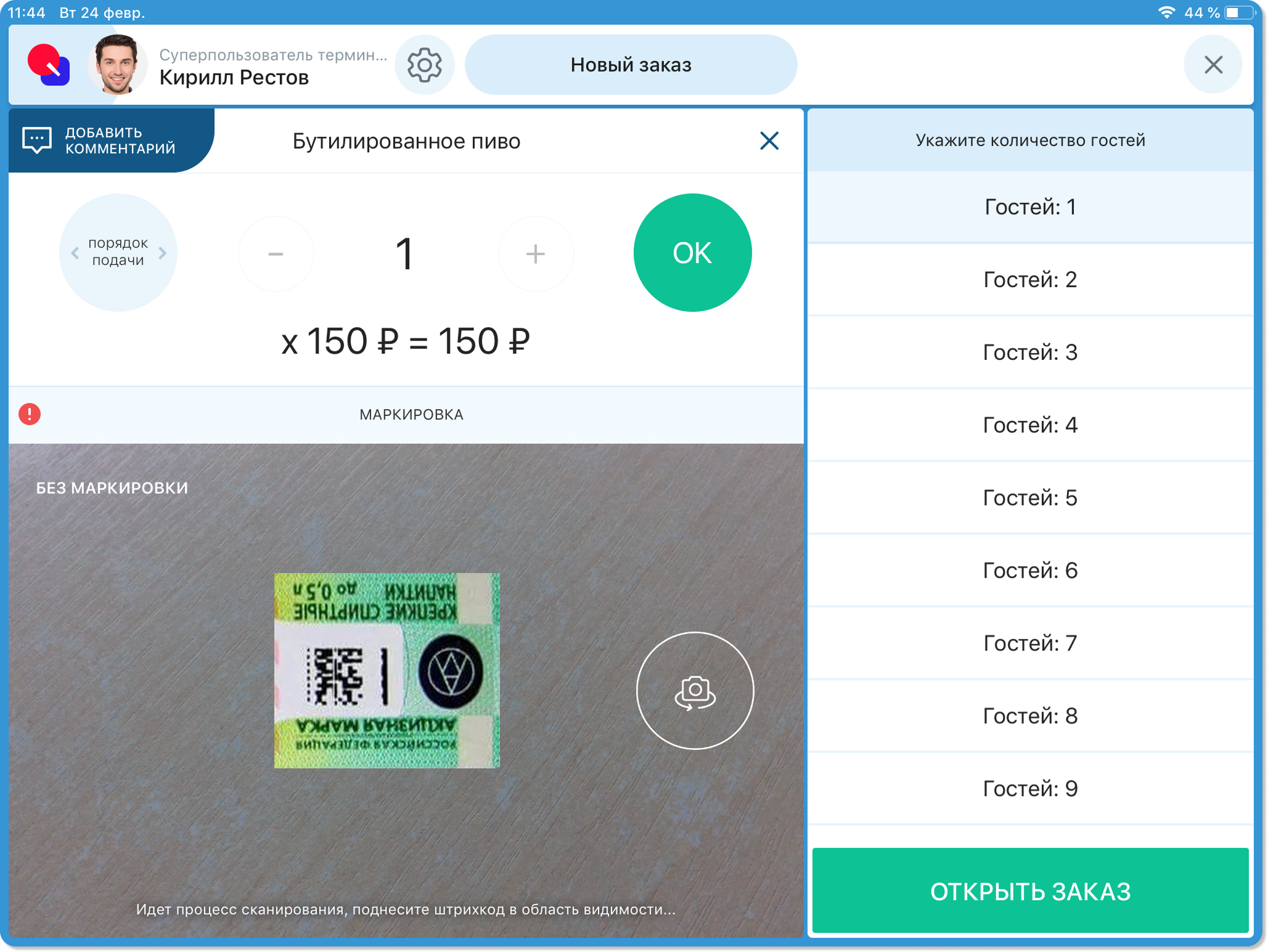 При реализации разливного пива марку сканировать не нужно, необходимо указать количество приобретаемого продукта. Марку не сканируем, так как при продаже передается значение GTIN, указанное в бэк-офисе при настройке блюда.