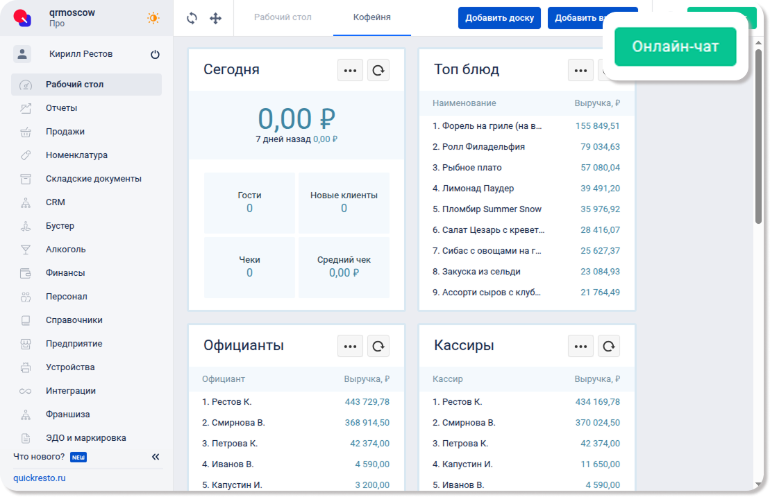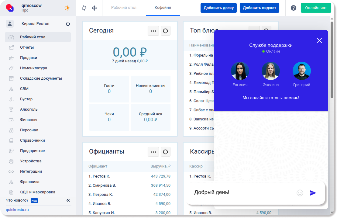 В чате бэк-офиса: Напишите напрямую из облака Quick Resto.