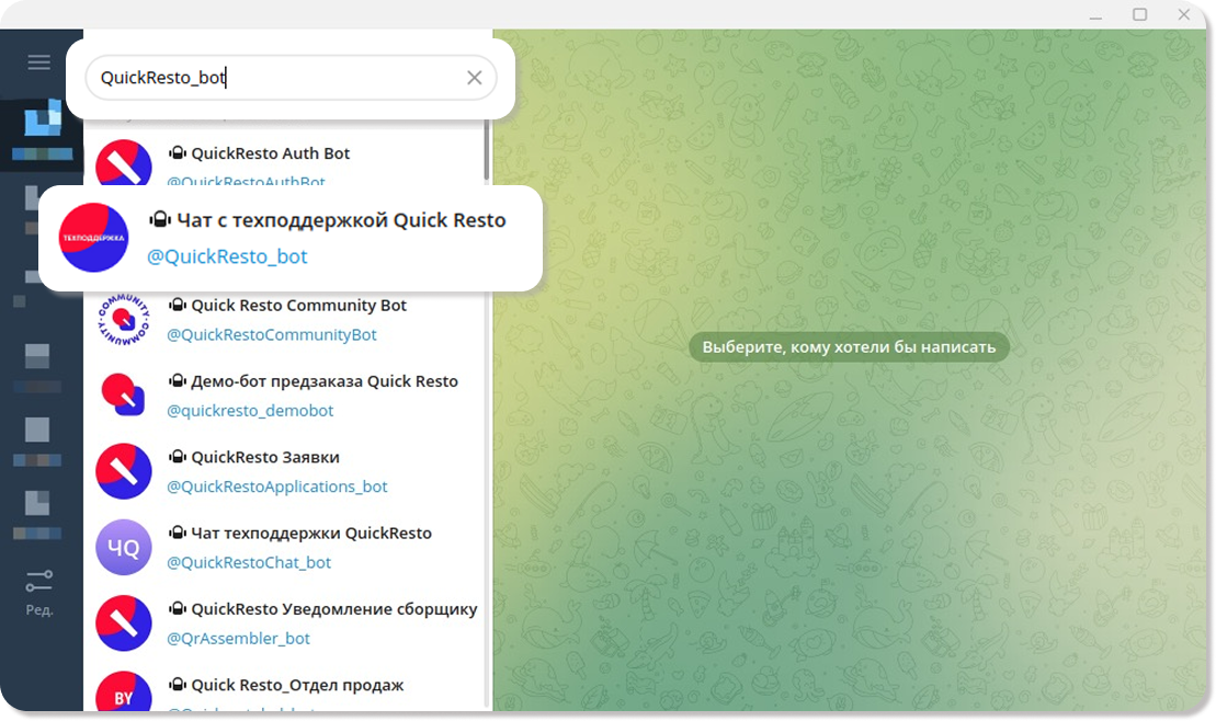 Имя контакта технической поддержки в Telegram: QuickResto_bot. Если автоматический переход не произошёл, вы можете скопировать это имя и вставить его в строку поиска внутри приложения Telegram, чтобы найти контакт и начать общение.