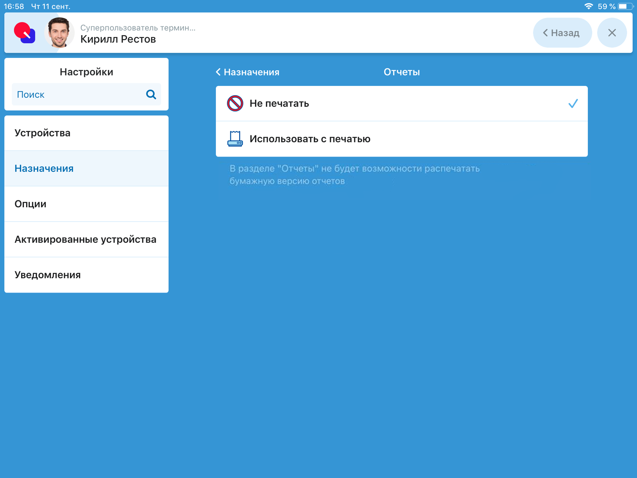 • Не печать — В разделе Отчеты не будет возможности распечатать бумажную версию отчетов.