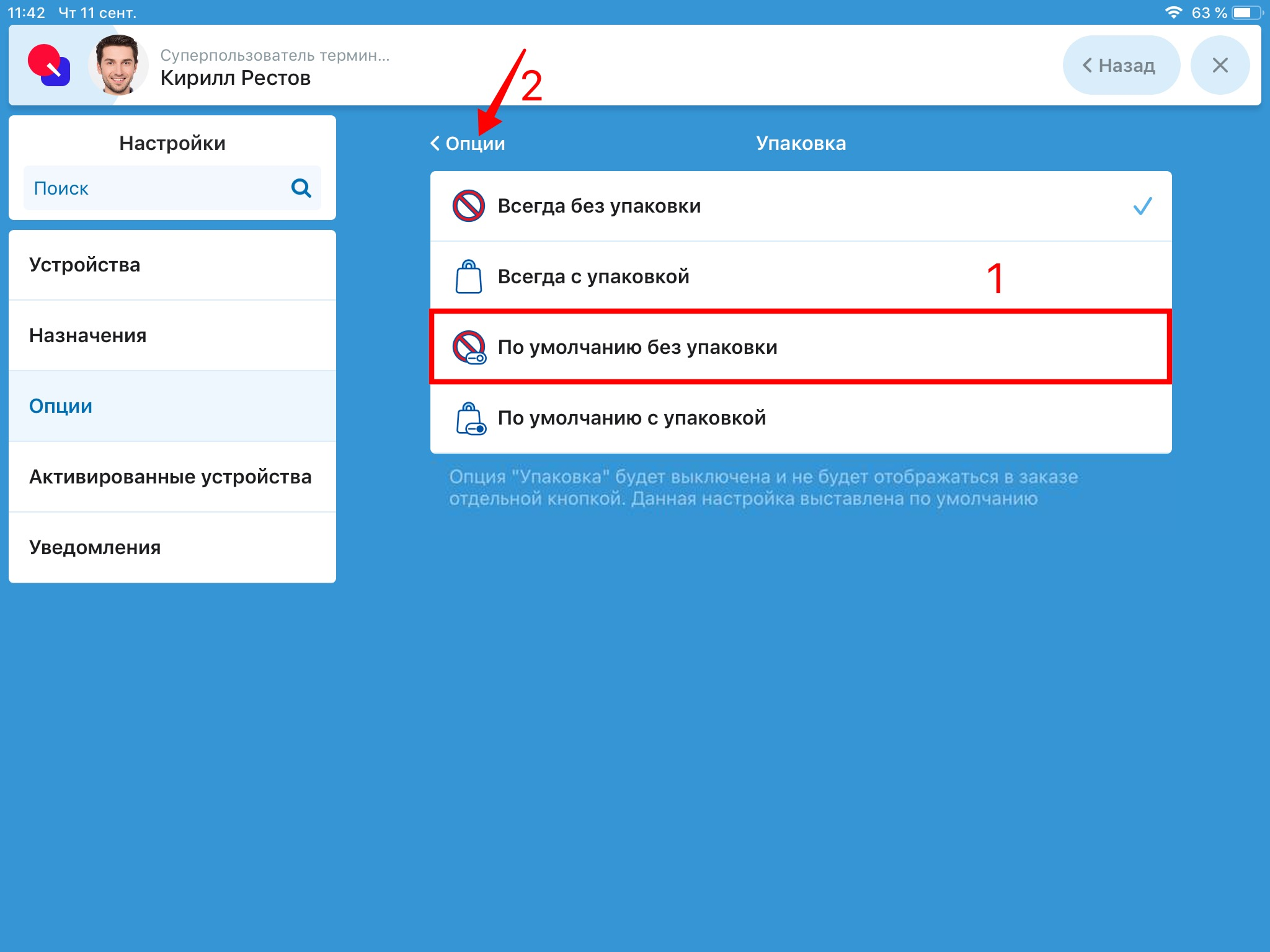 • По умолчанию без упаковки — опция Упаковка будет видима и по умолчанию отключена с возможностью включения в случае необходимости. Данная настройка подойдёт заведениям, которые осуществляют быстрые заказы, заказы на стол, доставку, а также оформляют выдачу заказов навынос.