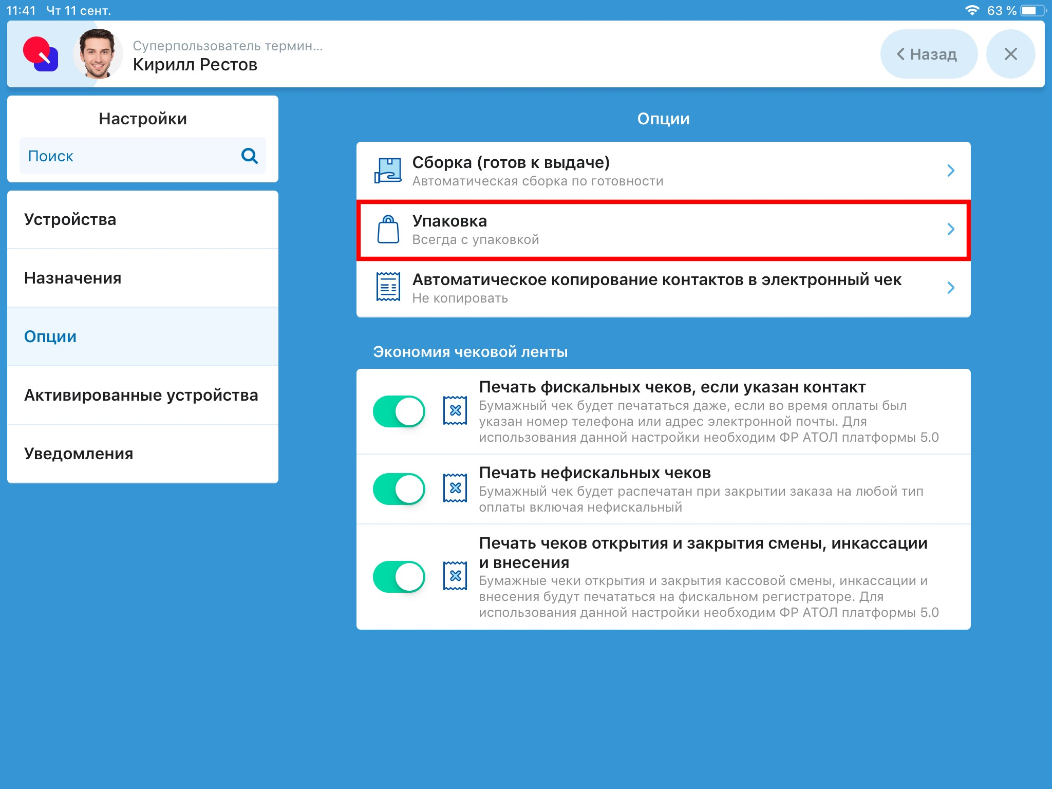 Если опция Упаковать не отображается, то её необходимо включить. Для этого нажмите на кнопку шестерёнки возле имени кассира и перейдите в раздел Настройки.
