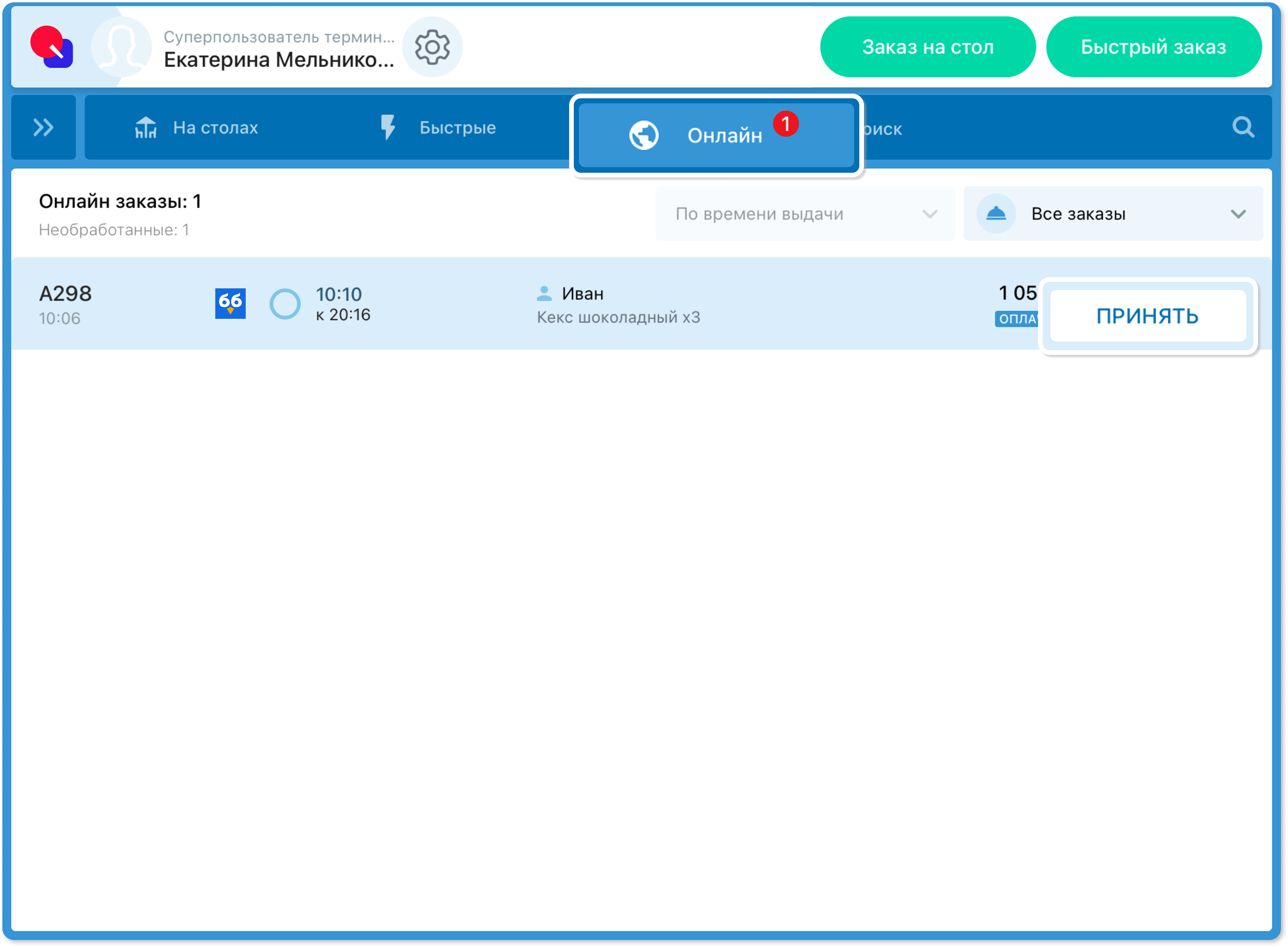 2. Заказ поступает на кассовый терминал Quick Resto и доступен для просмотра на вкладке Онлайн заказы.