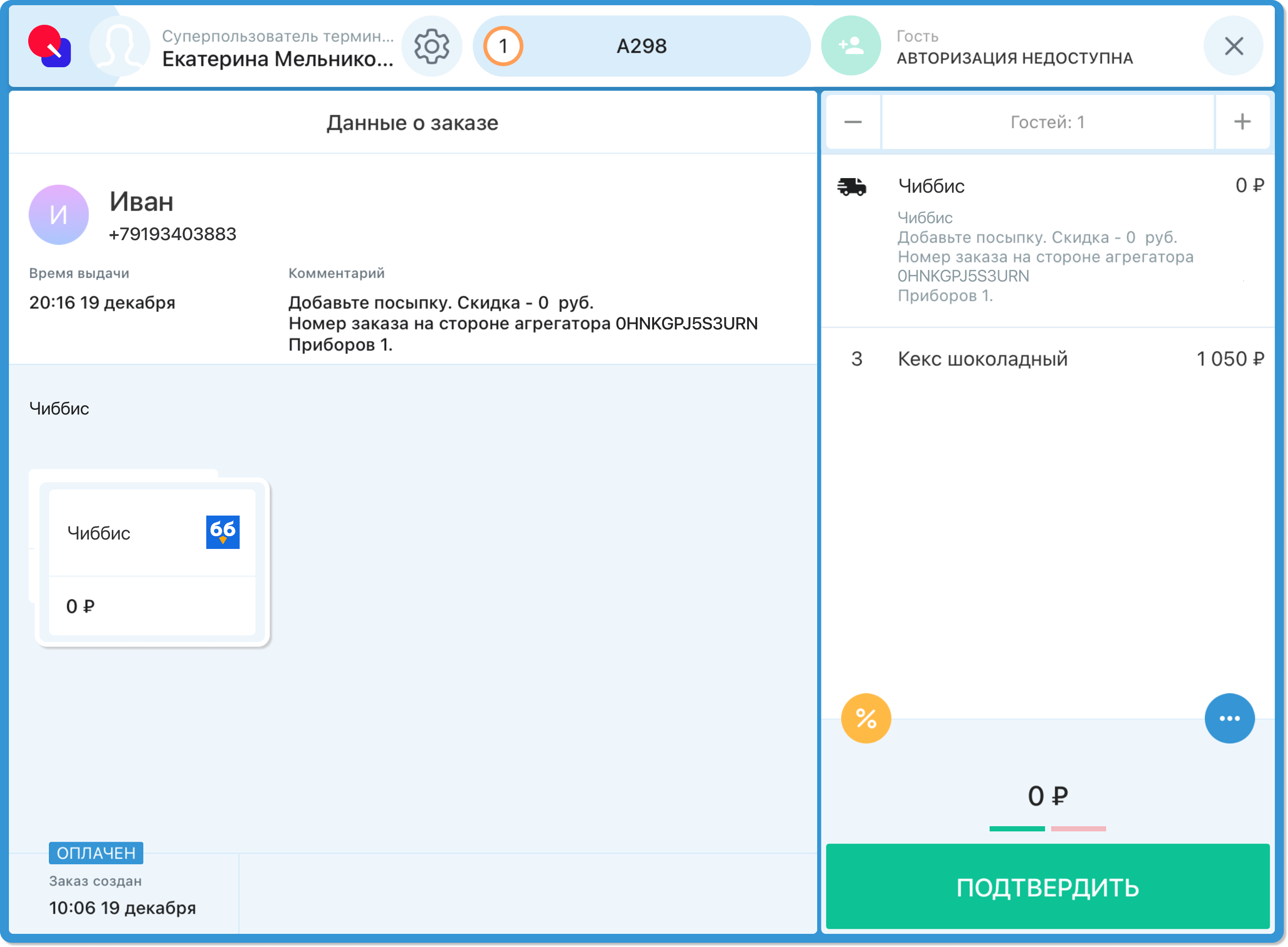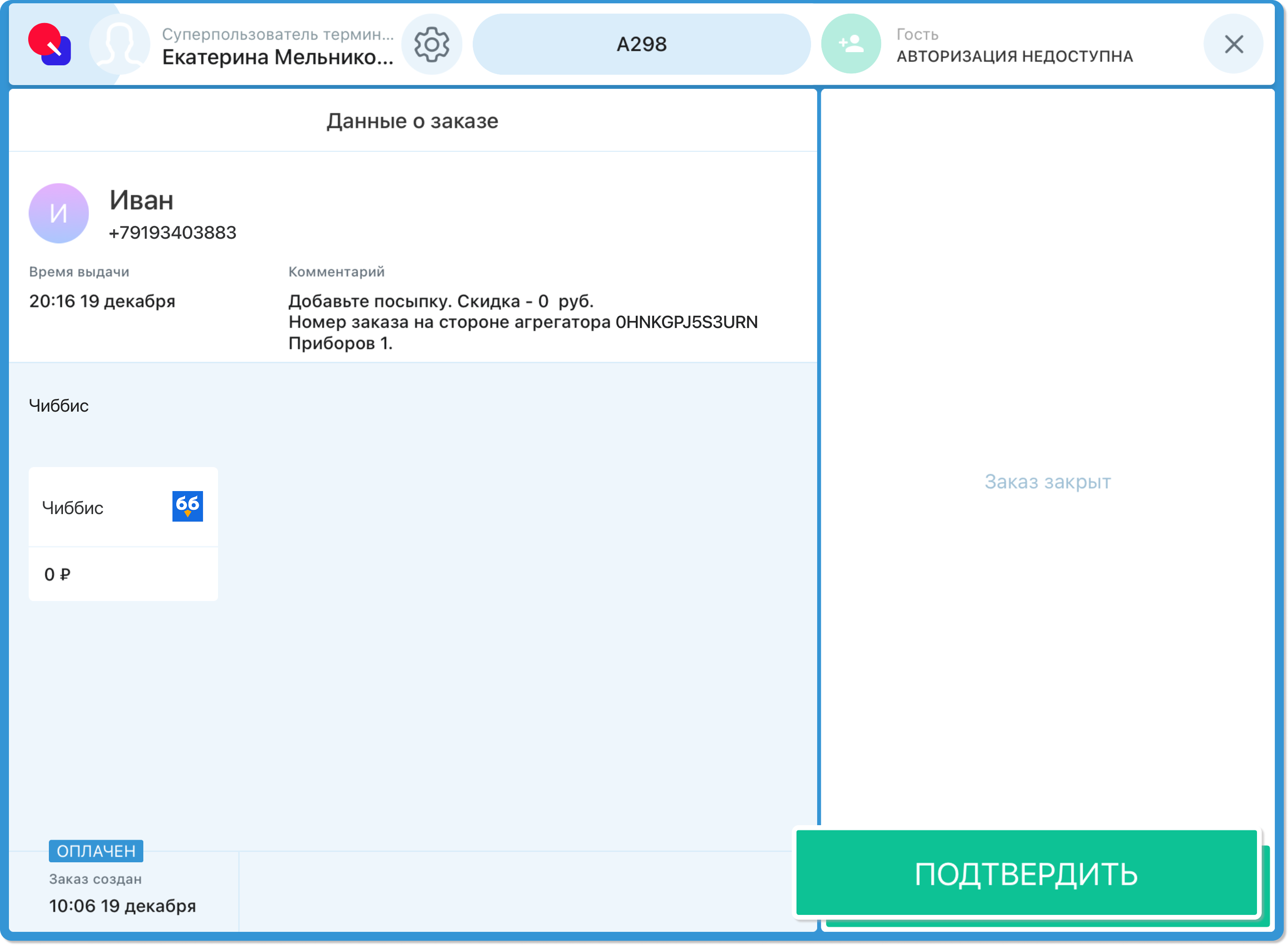 4. Необходимо Подтвердить полученный заказ и отправить его на кухню для приготовления.