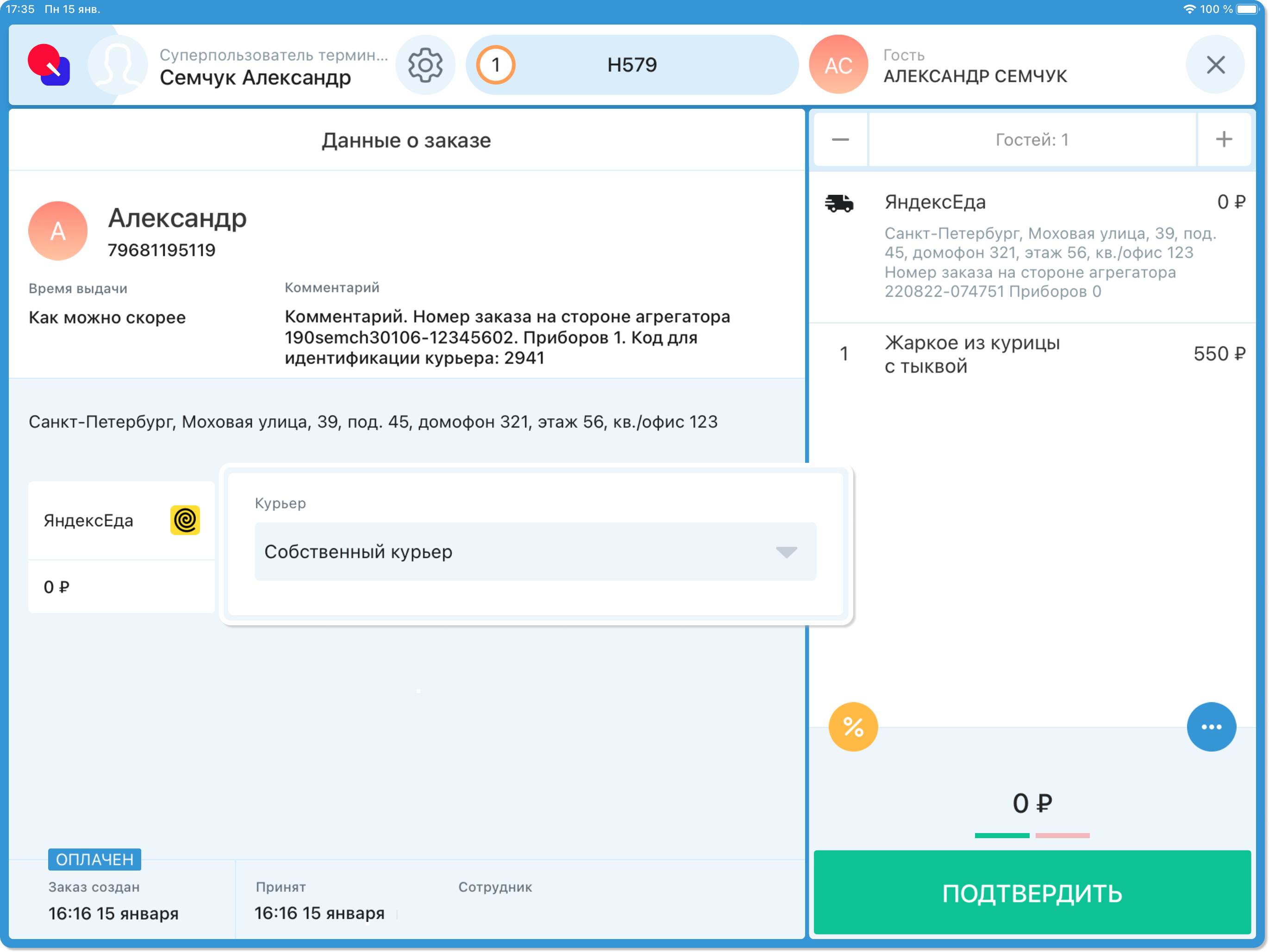 • Если заказ оформлен на доставку курьером Яндекс.Еда, то в поле Курьер указывается Курьер Яндекс.Еды.