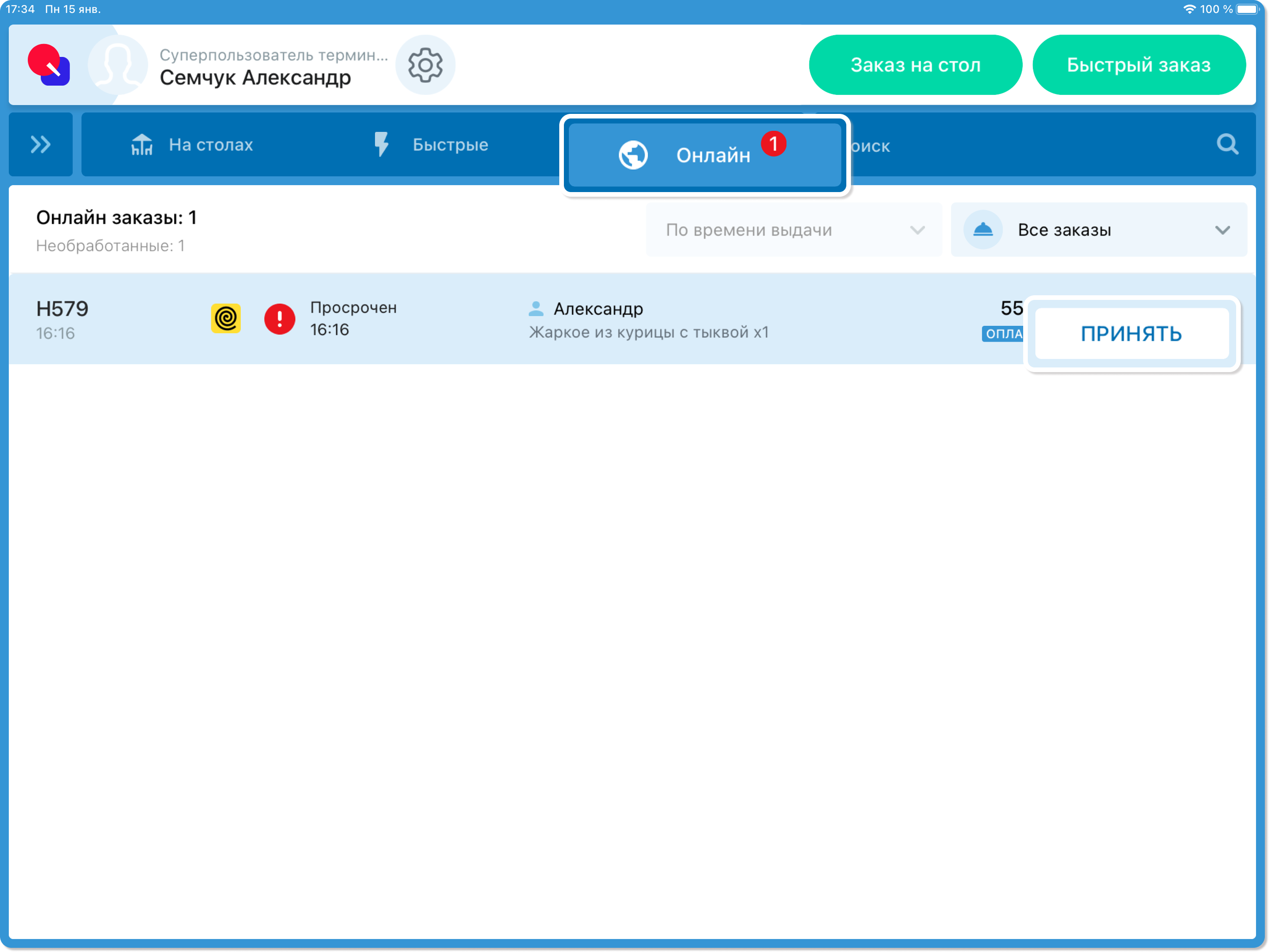 2. Заказ поступает на кассовый терминал Quick Resto и доступен для просмотра на вкладке Онлайн заказы.