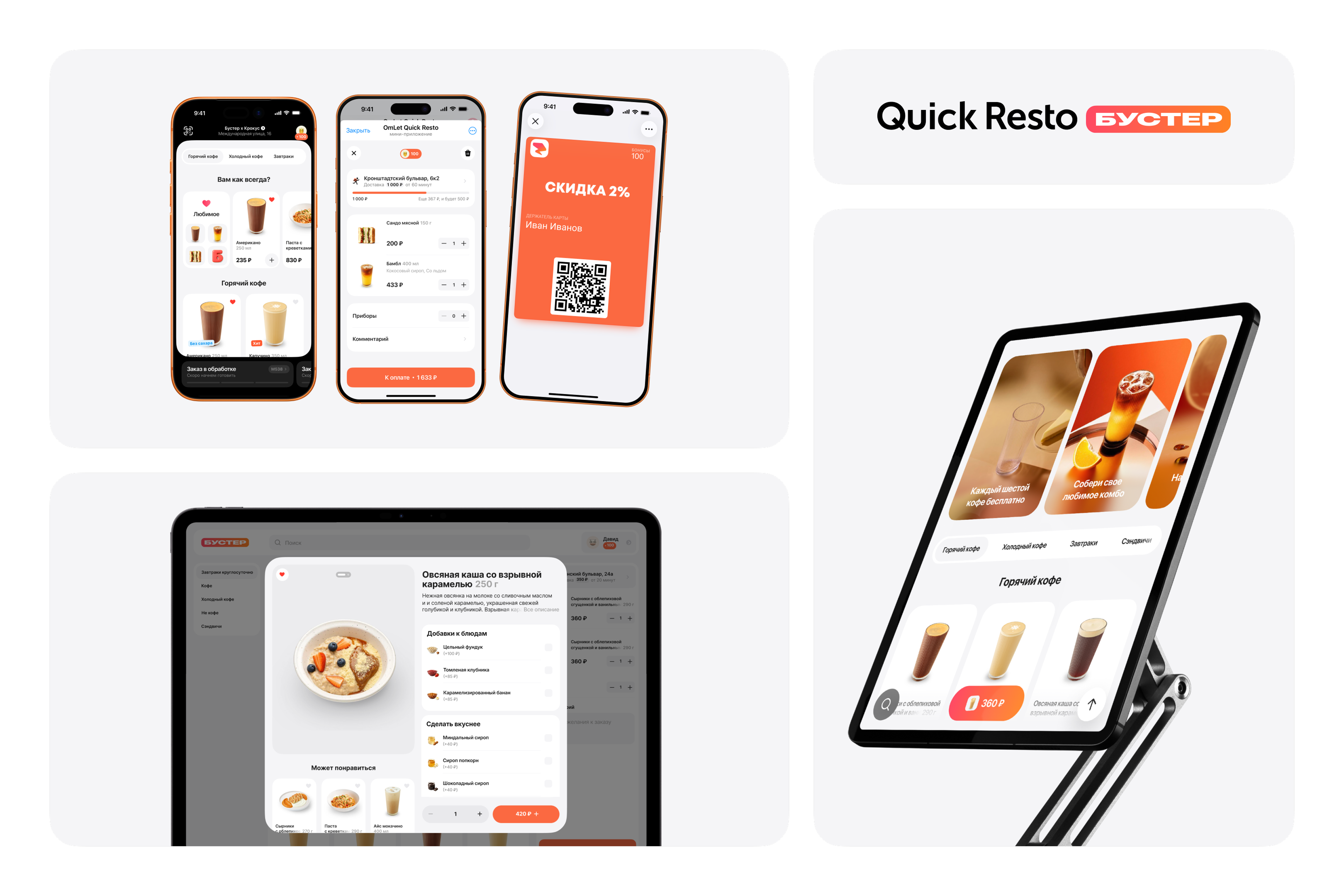 Продукты «Бустера» — это интегрированный комплекс цифровых решений, разработанный для увеличения продаж и размещенный на платформе Quick Resto. «Бустера» позволяет значительно увеличить продажи и оптимизировать рабочие процессы. Все элементы комплекса легко адаптируются под ваш корпоративный стиль, включая логотип, фирменные цвета и название, обеспечивая единое и узнаваемое представление бренда.