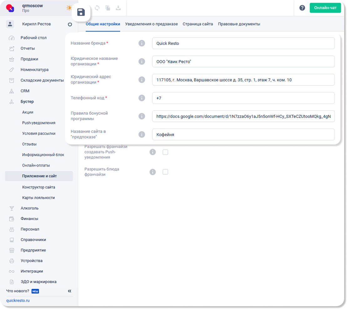 Юридическое название организации и Юридический адрес организации — официальное название вашей организации (например, ООО «Квик Ресто») и адрес, на который она зарегистрирована.