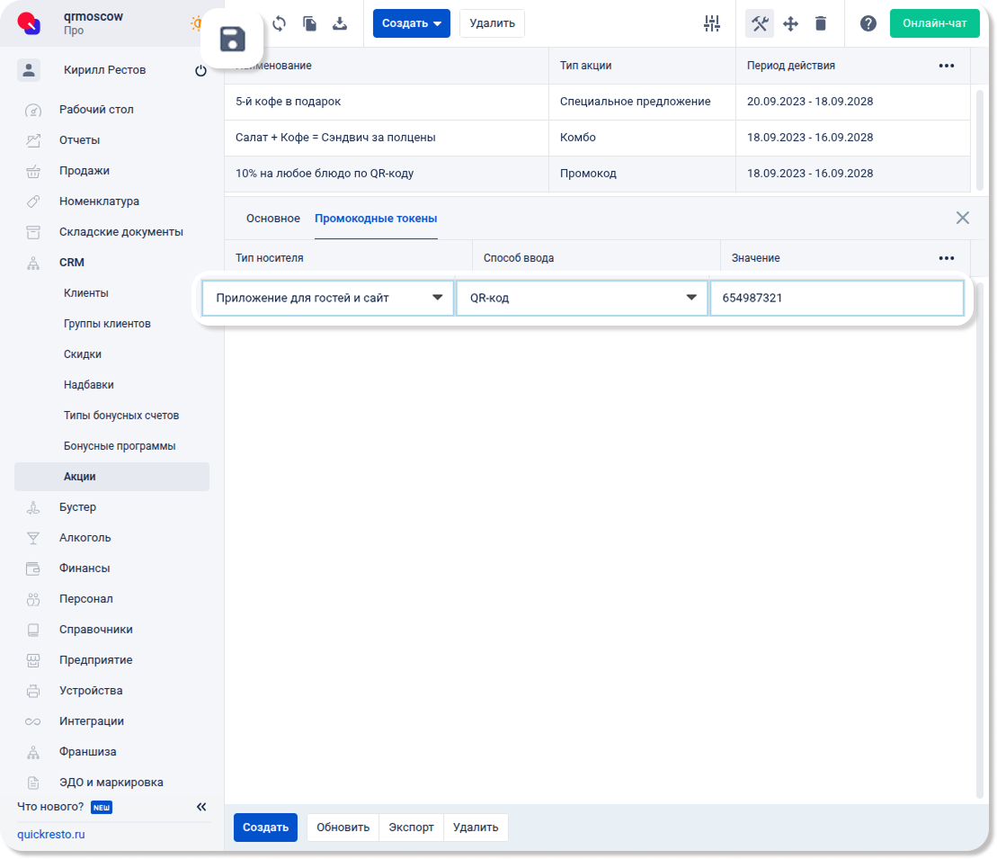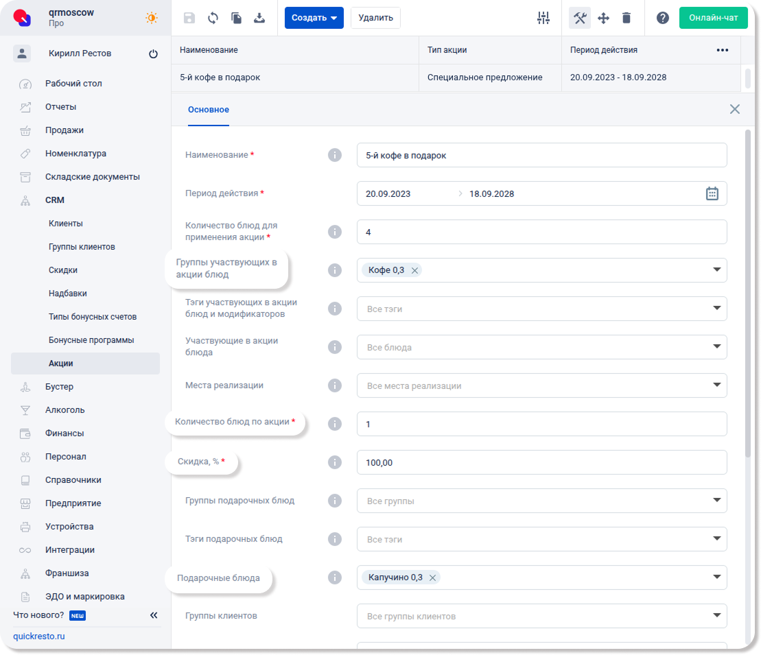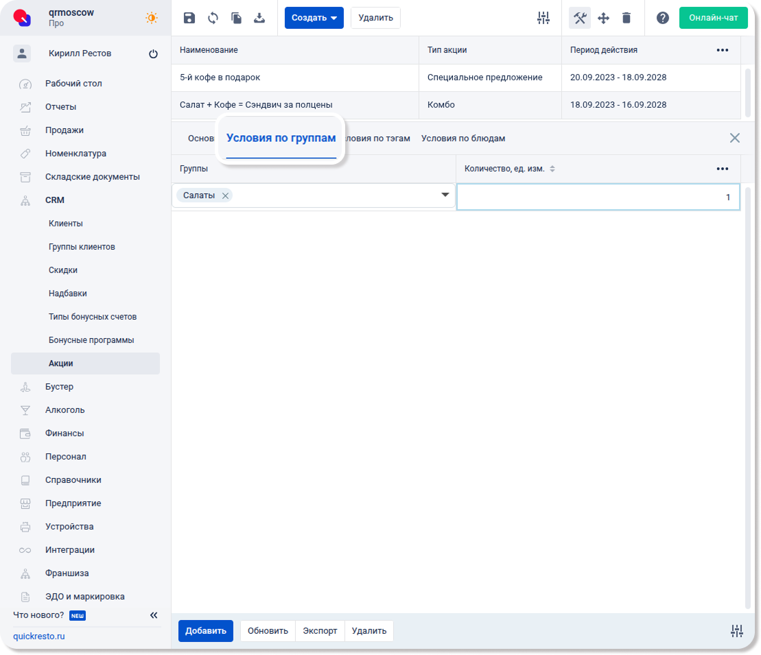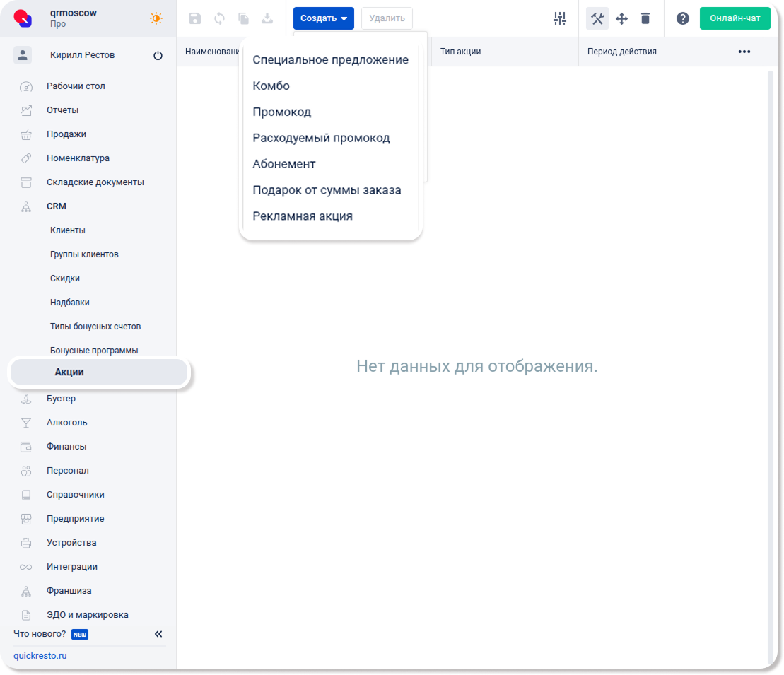 Кроме скидок и бонусных программ, в Quick Resto существуют акции, которые бывают нескольких типов: