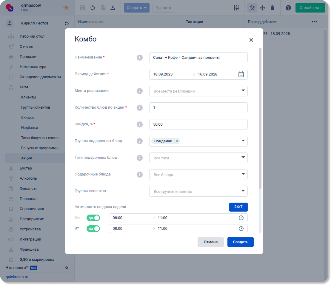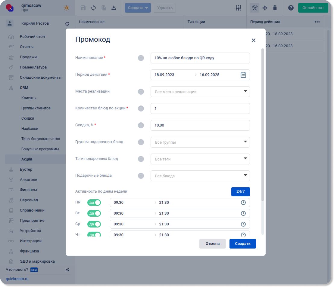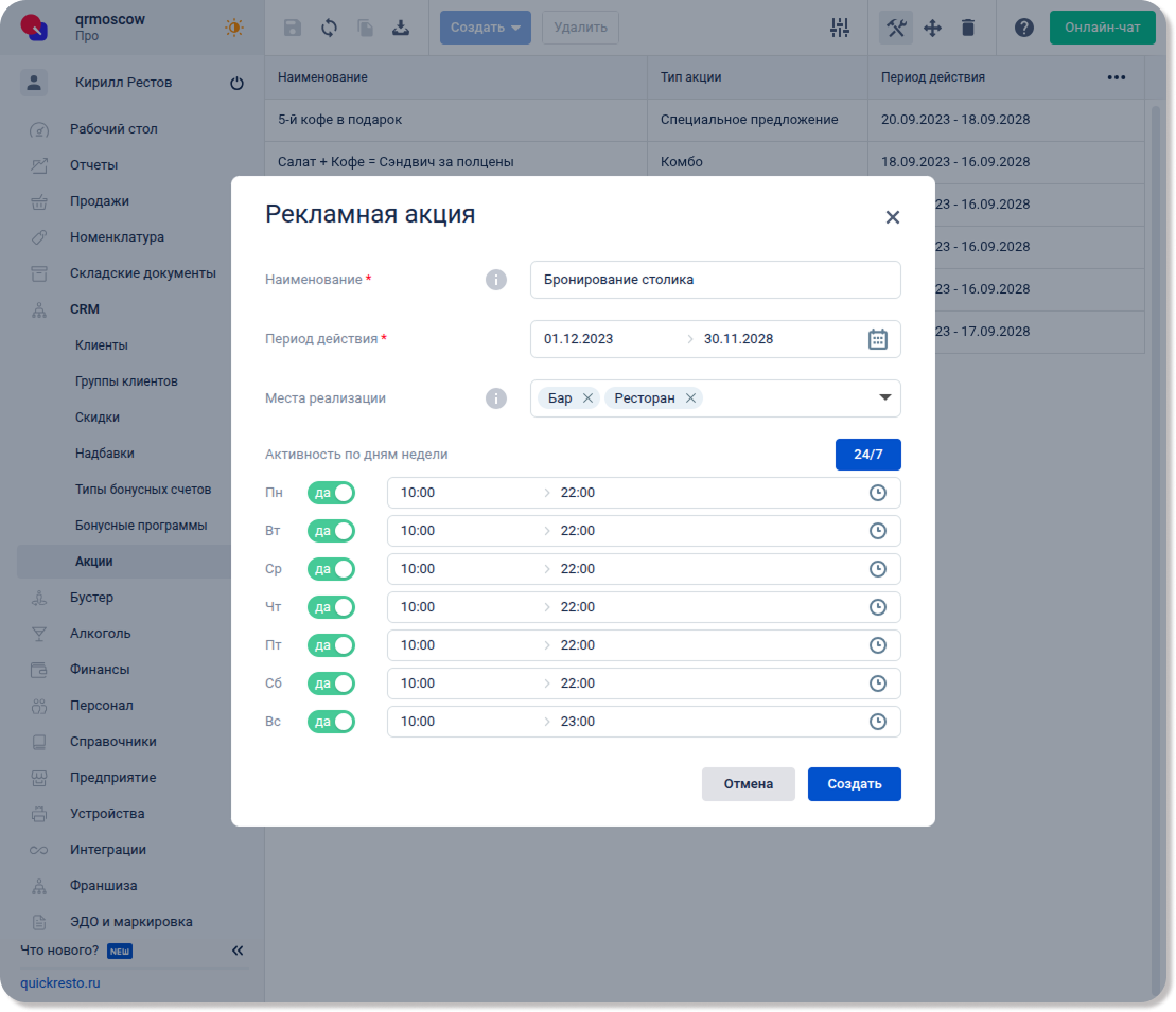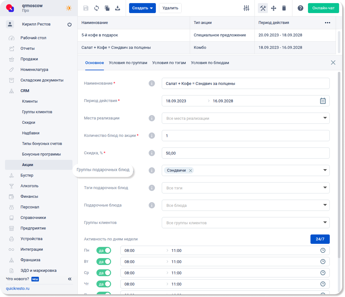 - Активность по дням недели — дни недели и время, в которые акция доступна на кассовом терминале, в приложении для гостей, на сайте и в Telegram-боте. Если ни один день не выбран, акция не будет отображаться на терминале, в приложении для гостей, на сайте и в Telegram-боте. Если нужно, чтобы акция была доступна для применения всегда, нажмите кнопку 24/7 и, если необходимо, измените время (например, на время открытия и закрытия заведения).