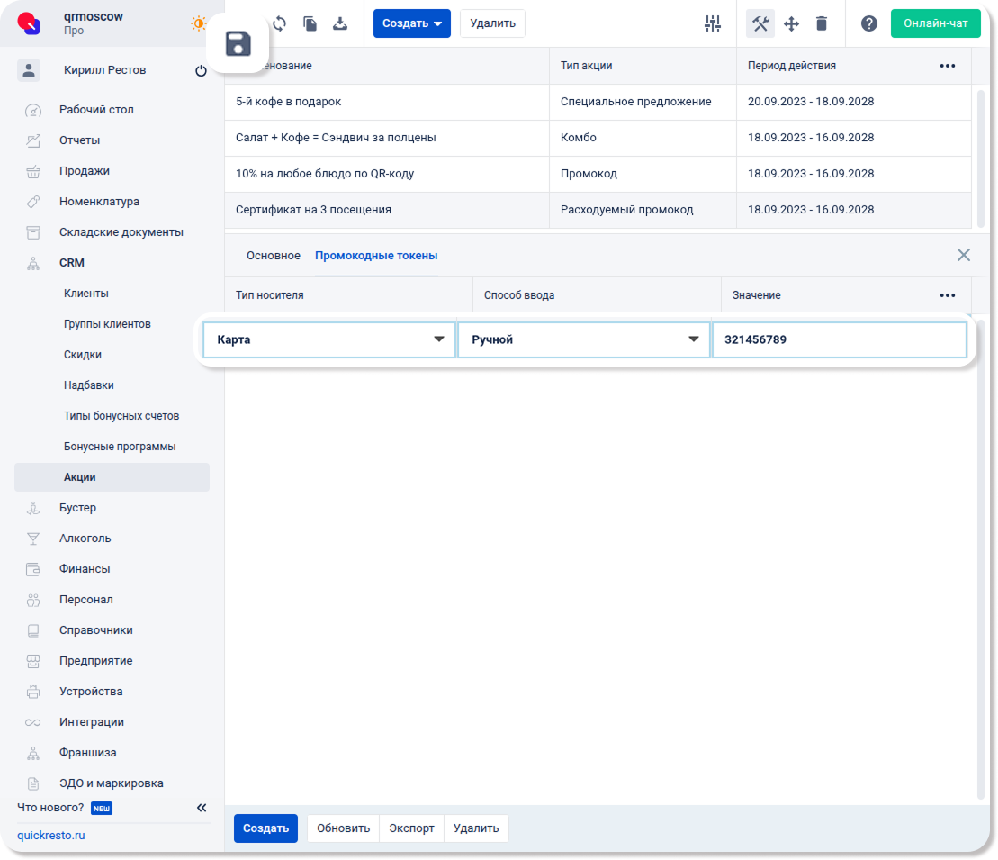 После создания промокода необходимо заполнить его вкладку под названием Промокодные токены. В этой вкладке перечисляются все физические носители промокода (штрих-код, ручной ввод, QR-код, карта с магнитной полосой).
