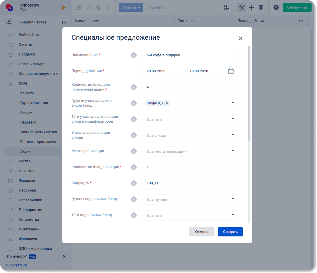 2. В открывшемся окне заполнить обязательные поля, в поле Количество блюд для применения акции ставим 4, так как нам нужно, чтобы гость при совершении 5-й покупки получил кофе в подарок.