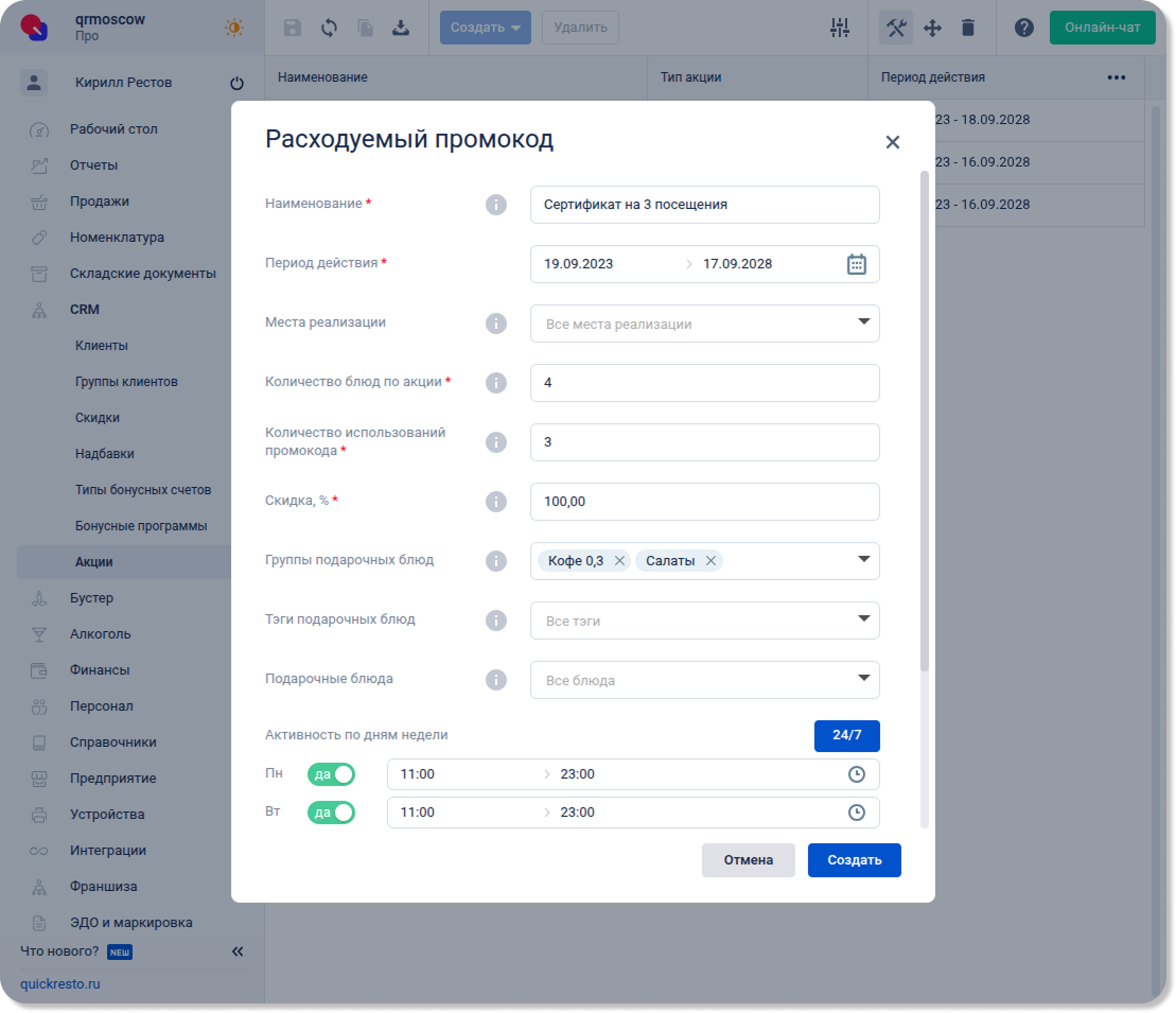 - Количество блюд по акции — количество блюд, которое клиент сможет приобрести по акции.
