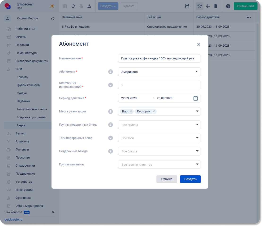 2. В разделе CRM — Акции создайте акцию типа Абонемент и укажите в ее настройках созданное блюдо в поле Абонемент.