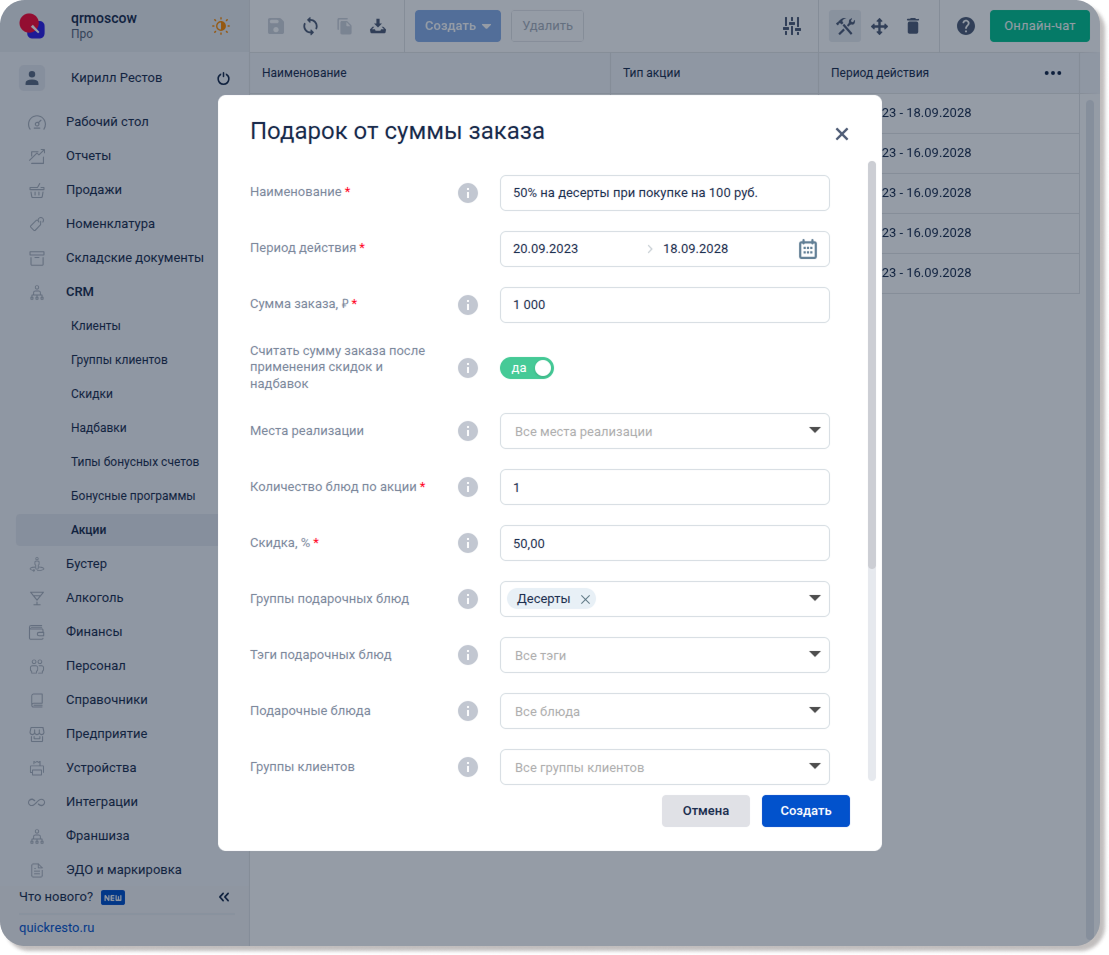 - Скидка, % — величина скидки, которая применяется к подарочным блюдам акции.