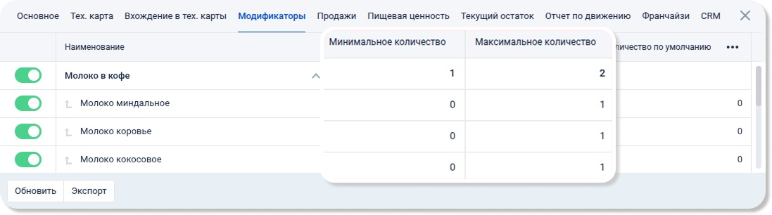 Если к блюду привязаны модификаторы, то для корректной работы с сервисом Чиббис модификаторы должны быть настроены следующим образом: