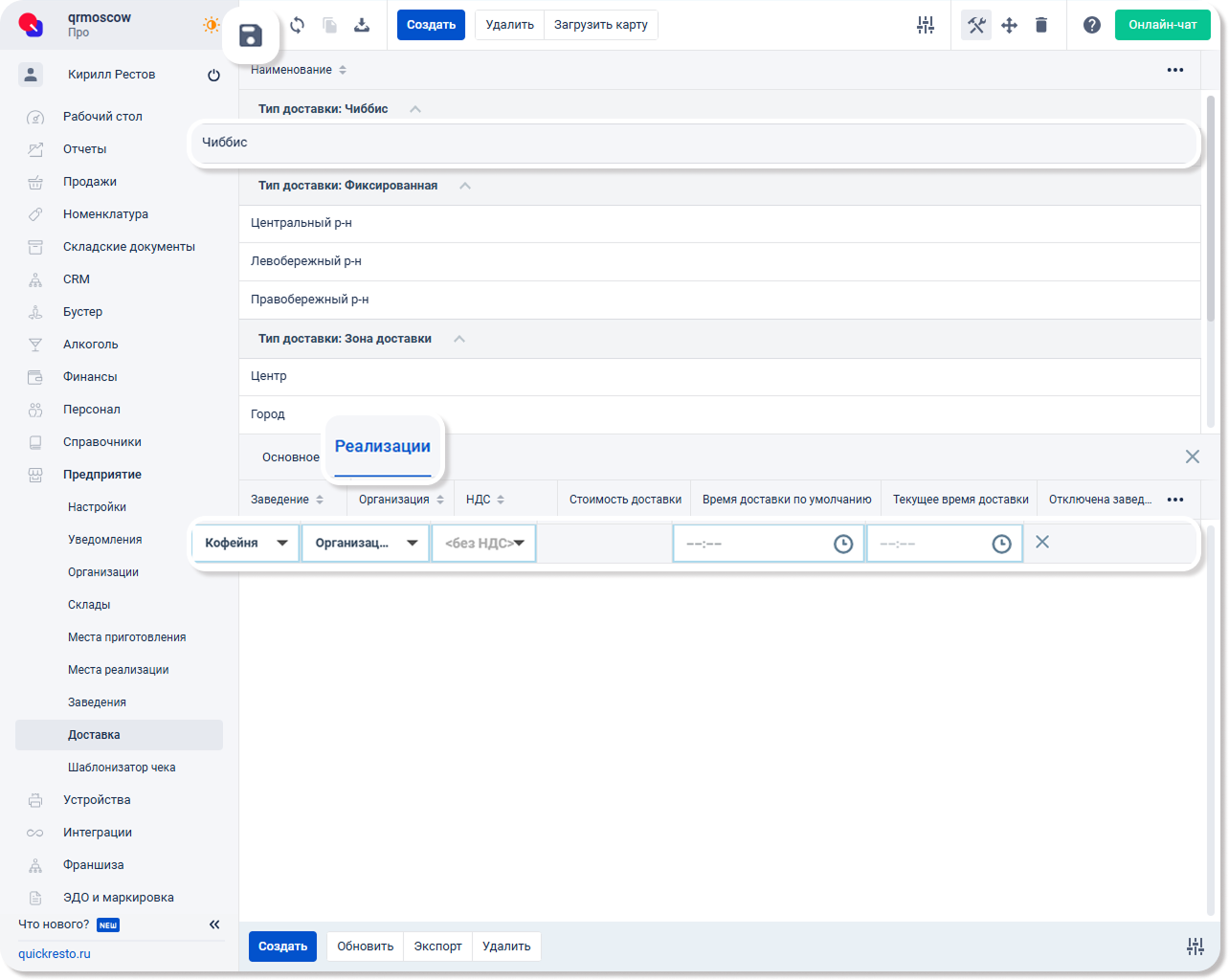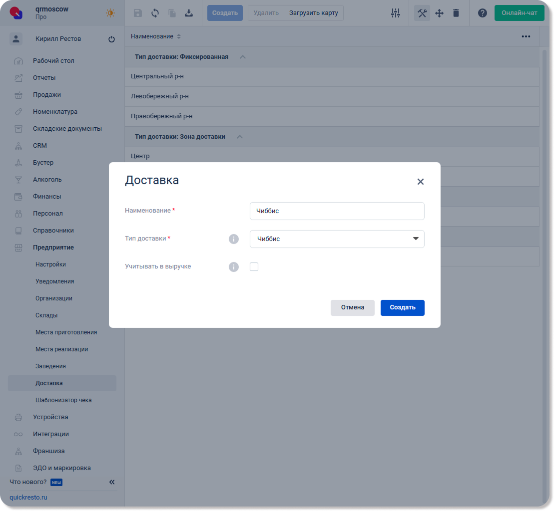 В бэк-офисе перейдите в раздел Предприятие — Доставка. Добавьте типы доставок: Чиббис и/или Силами заведения. Это необходимо для приема и доставки онлайн-заказов силами курьерской службы Чиббис или собственной курьерской службы заведения.