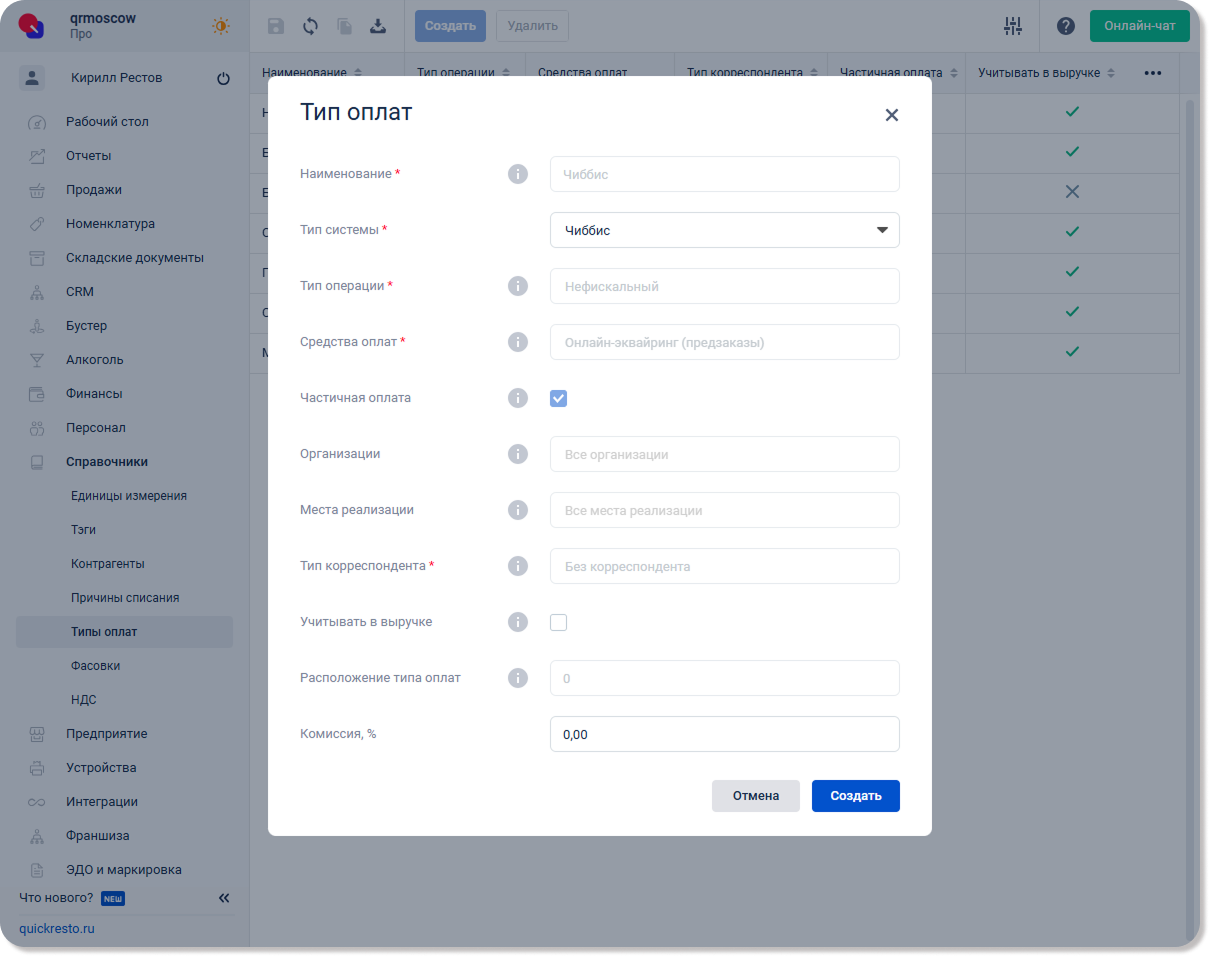 В бэк-офисе перейдите в раздел Справочники — Типы оплат. Добавьте типы оплат: Чиббис и Чиббис Навынос. Это необходимо, чтобы установить различную комиссию за заказы на доставку и навынос. Для того, чтобы добавить тип оплат: