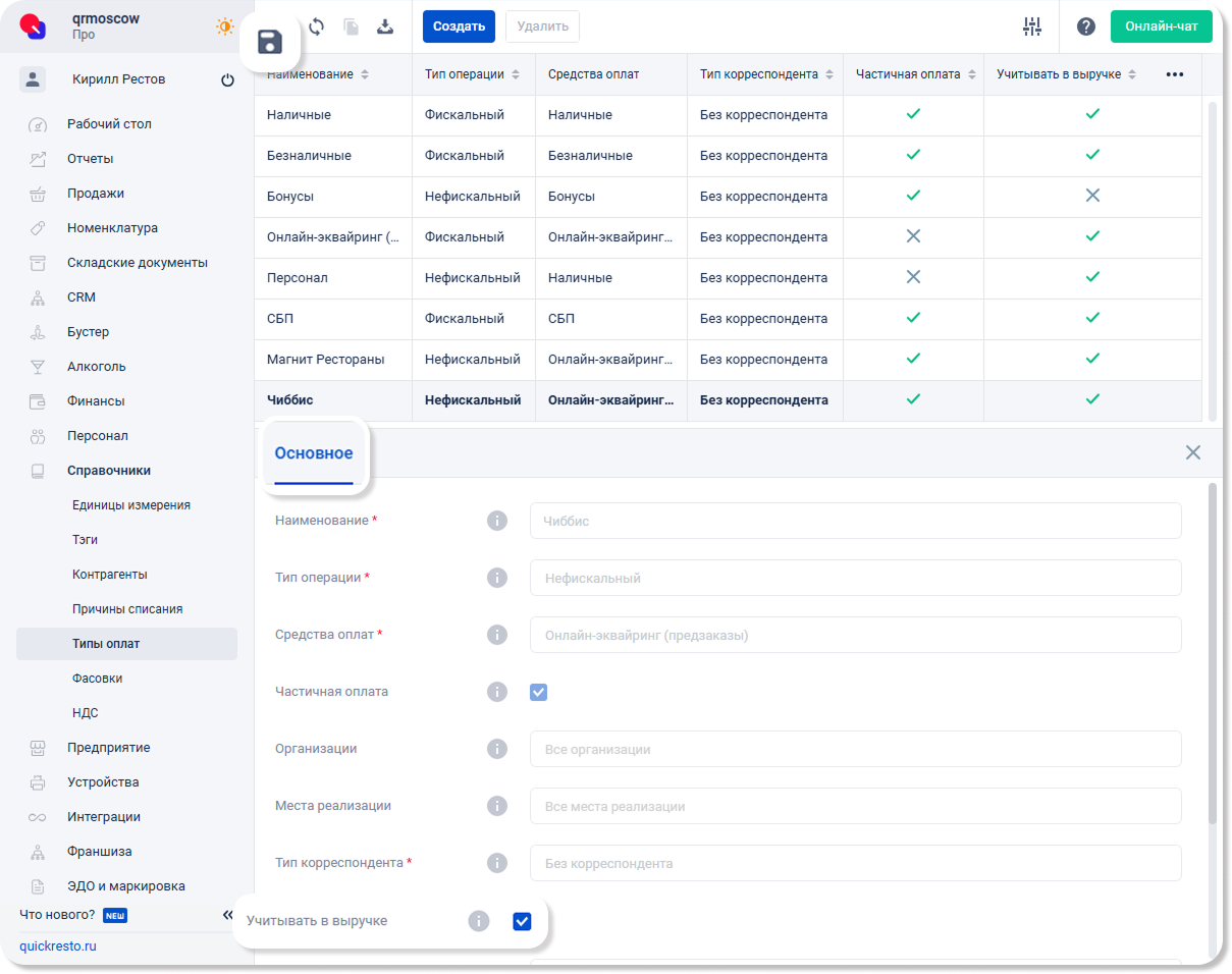 Если необходимо учитывать данный тип оплат в выручке, то на вкладке Основное активируйте флаг Учитывать в выручке и нажмите Сохранить на верхней панели инструментов.
