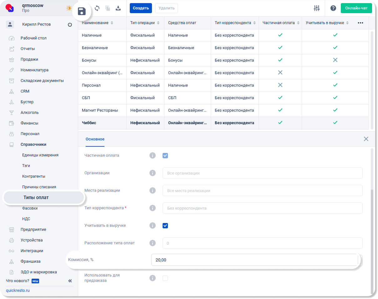 1. В разделе Предприятие — Настройки активируйте флаг Использовать комиссию в типах оплат.