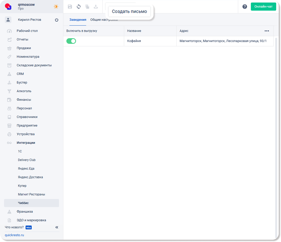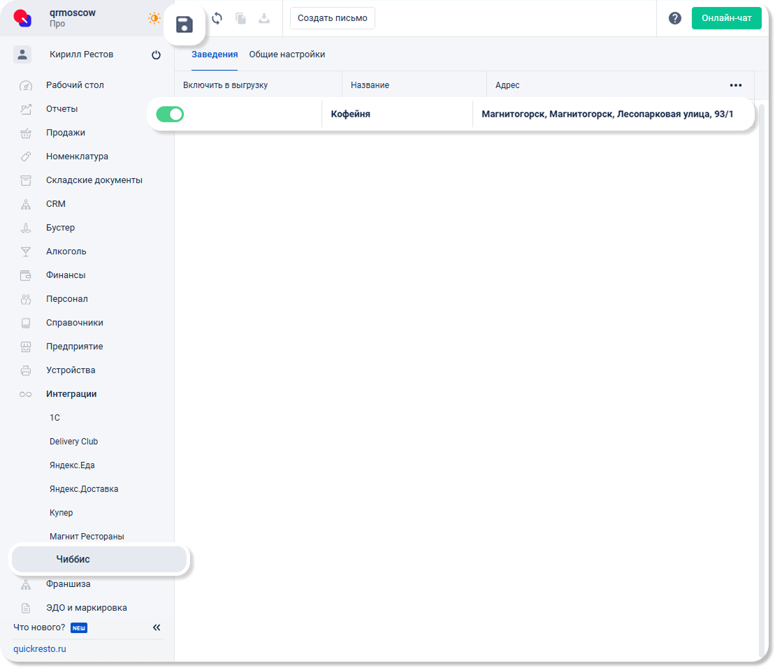 После настройки типов доставки, способов оплаты и онлайн-меню, можно синхронизировать данные бэк-офиса с сервисом Чиббис. Для этого перейдите в раздел Интеграции — Чиббис на вкладку Заведения.
