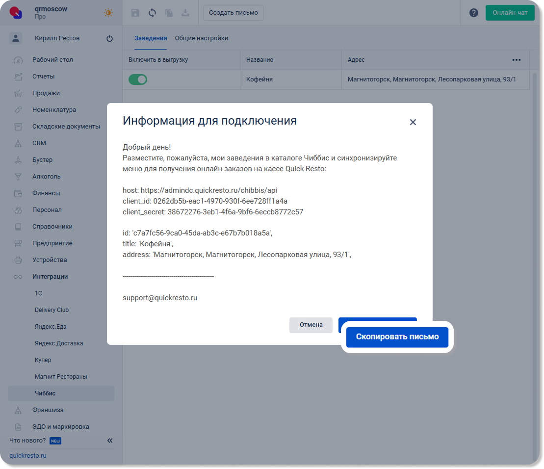 5. После этого отправьте вашему менеджеру Чиббис скопированный текст письма для настройки синхронизации меню.