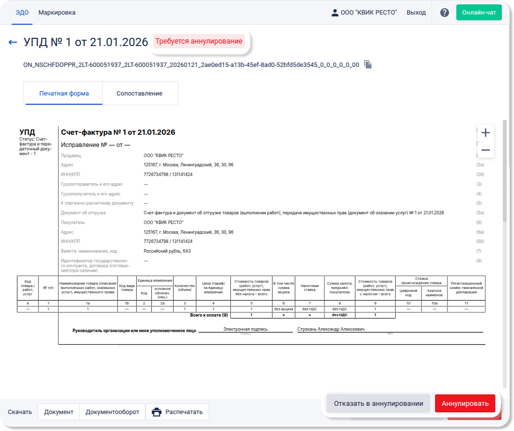• Контрагент инициировал аннулирование документа. В этом случае документу будет присвоен статус Требуется аннулирование. У вас будет выбор: либо Отказать в аннулировании, либо Аннулировать документ.